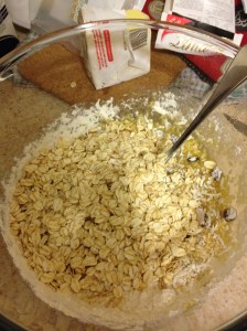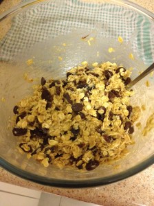 In one bowl combine all the wet ingredients (butter, honey, vanilla extract). Then add the dry ingredients, with the oats and flour last. I tend to start on the low end of the measurement and then add a bit more until the dough comes together to the degree I want it to. Add the raisins, coconut, and chocolate chips last. When it’s all mixed together, pop it in the fridge for at least 30 minutes. I refrigerate almost all of my cookie doughs for at least 30 minutes and a lot of the time overnight. My colleagues are often shocked/amazed by the fact that I can come into work with a fresh batch of warm cookies, but it’s really far simpler than it looks – once your dough is in the fridge overnight, all you have to do is pop it in the oven when you are getting ready in the morning, and boom – instant baked goods perfection and heaps of friends.