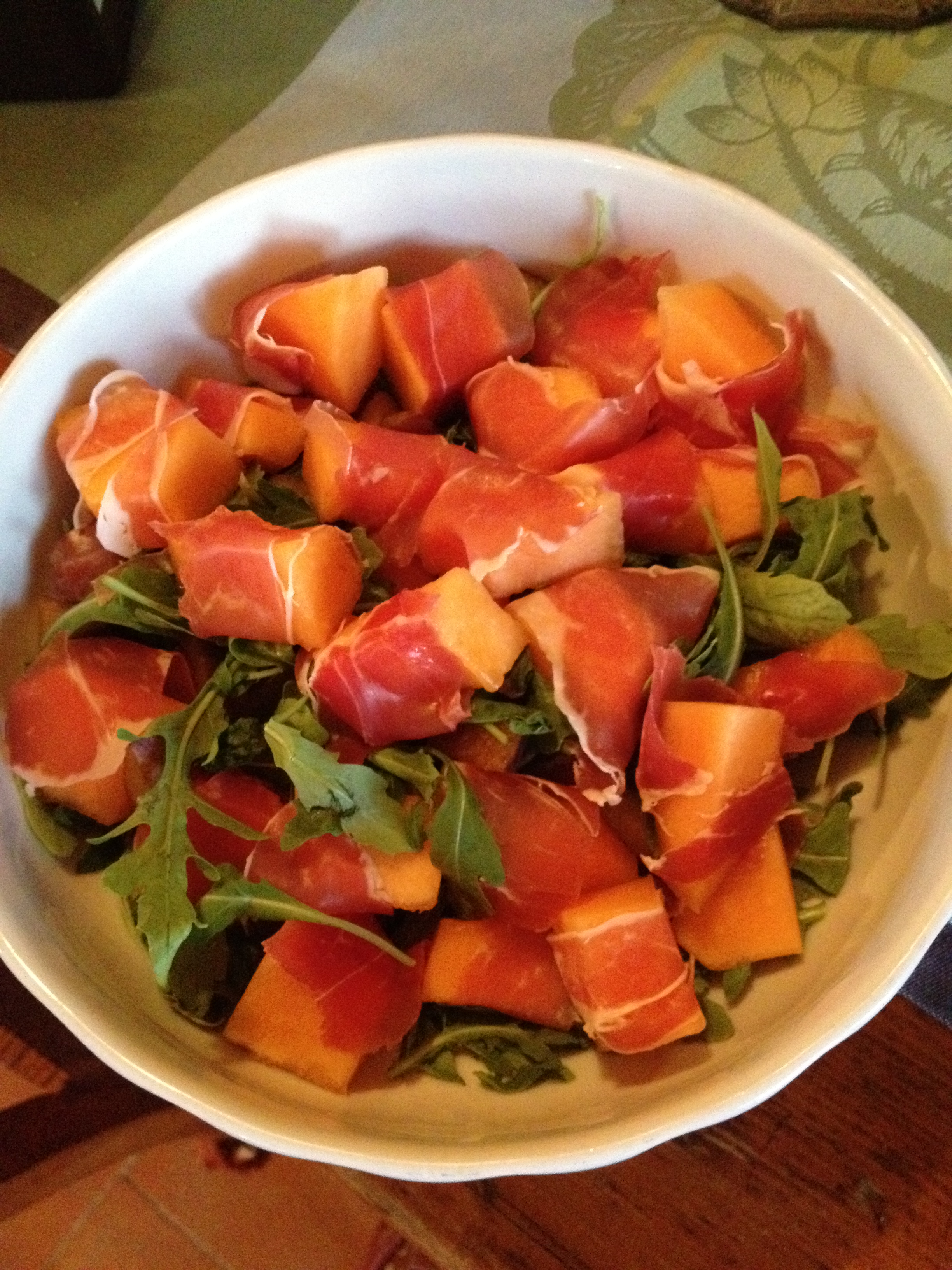 First I made an arugala salad with fresh plums and melon wrapped in proscuitto…definitely the kind of meal you literally can just throw together (just requires a bit of chopping of the melon and plums)