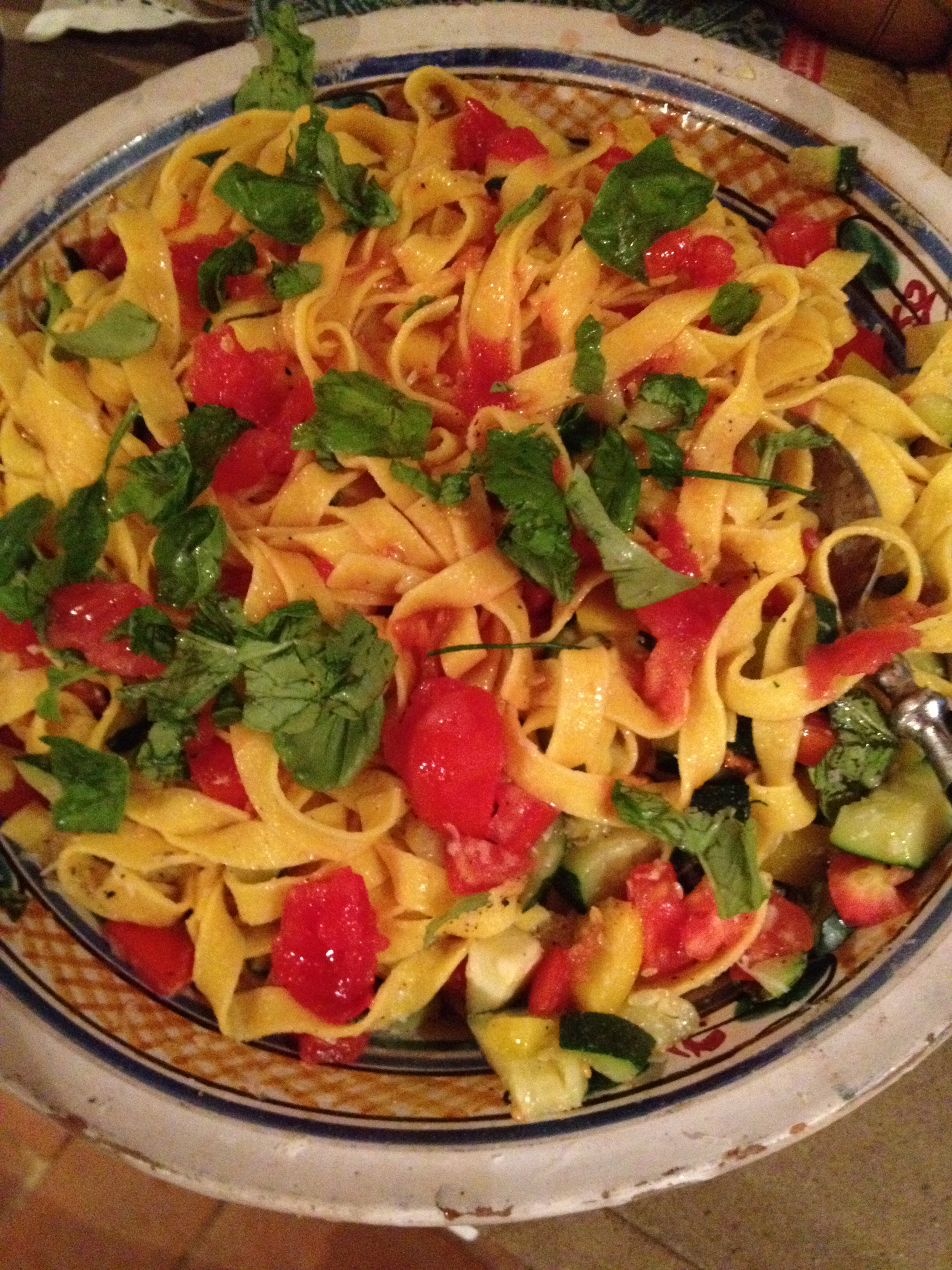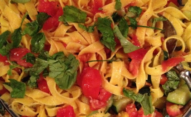 For the main I did a quick pasta with veggies and fresh basil and grated parmesan – I took the basil from the garden outside the house, used some nice pasta they had on hand, and made no sauce at all – just used the juice from the tomatoes and a bit of olive oil, seasoned to taste with sea salt and black pepper. I also threw in zucchini and peppers, and everything cooked slightly from the heat of the pasta. Accompanied by liberal amounts of prosecco, this was a great meal and a fantastic start to the weekend.