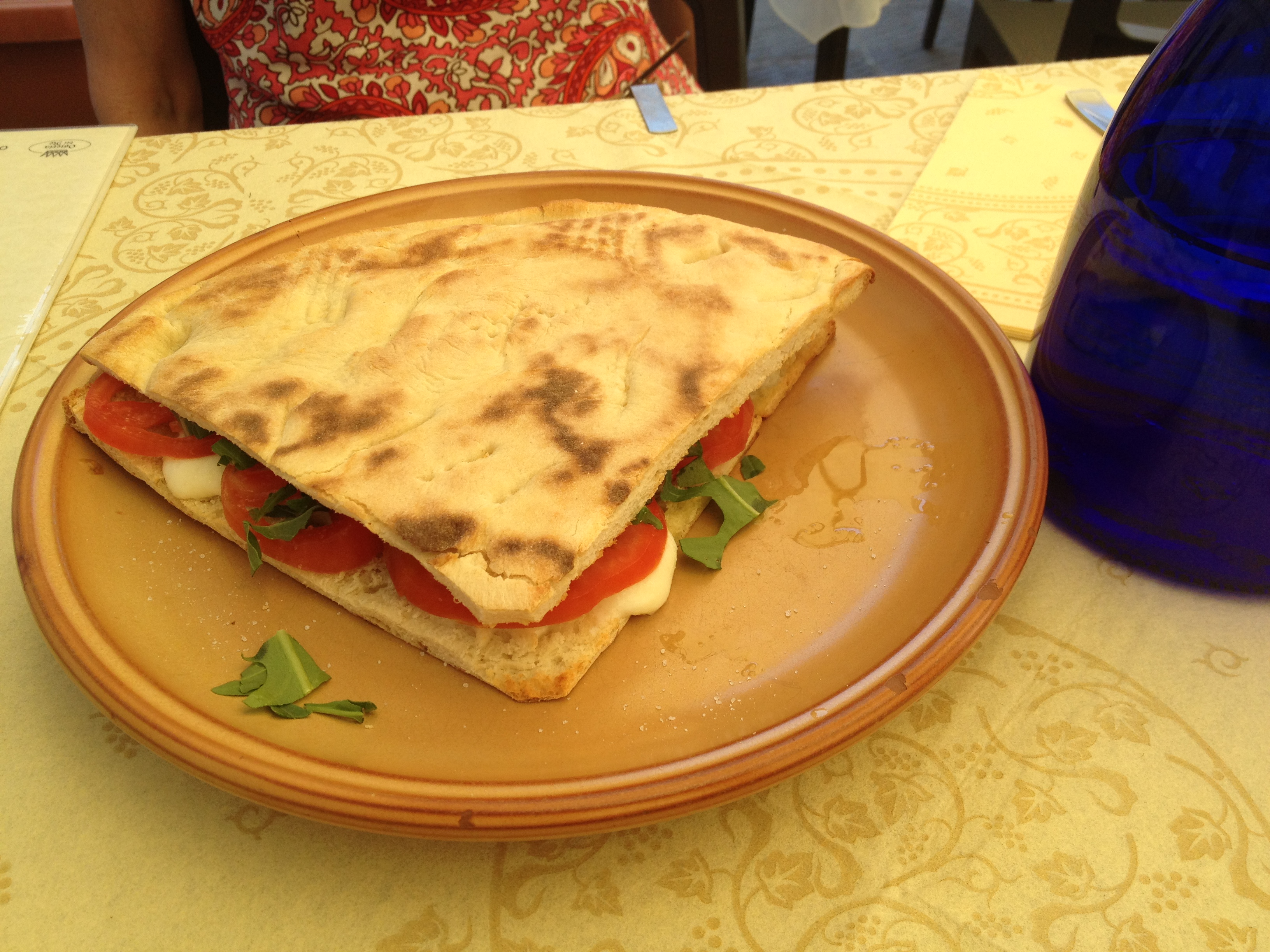 Starting at the back and moving clockwise, there were bruschetta with mushrooms and crispy bacon, polenta, a frittata, a potato, fried zucchini flower and bread, and more bread to be eaten with cheese and proscuitto. Even thought it was quite hot, the bean soup in the middle was also delicious. And we also got this fantastic caprese sandwich with arugala: