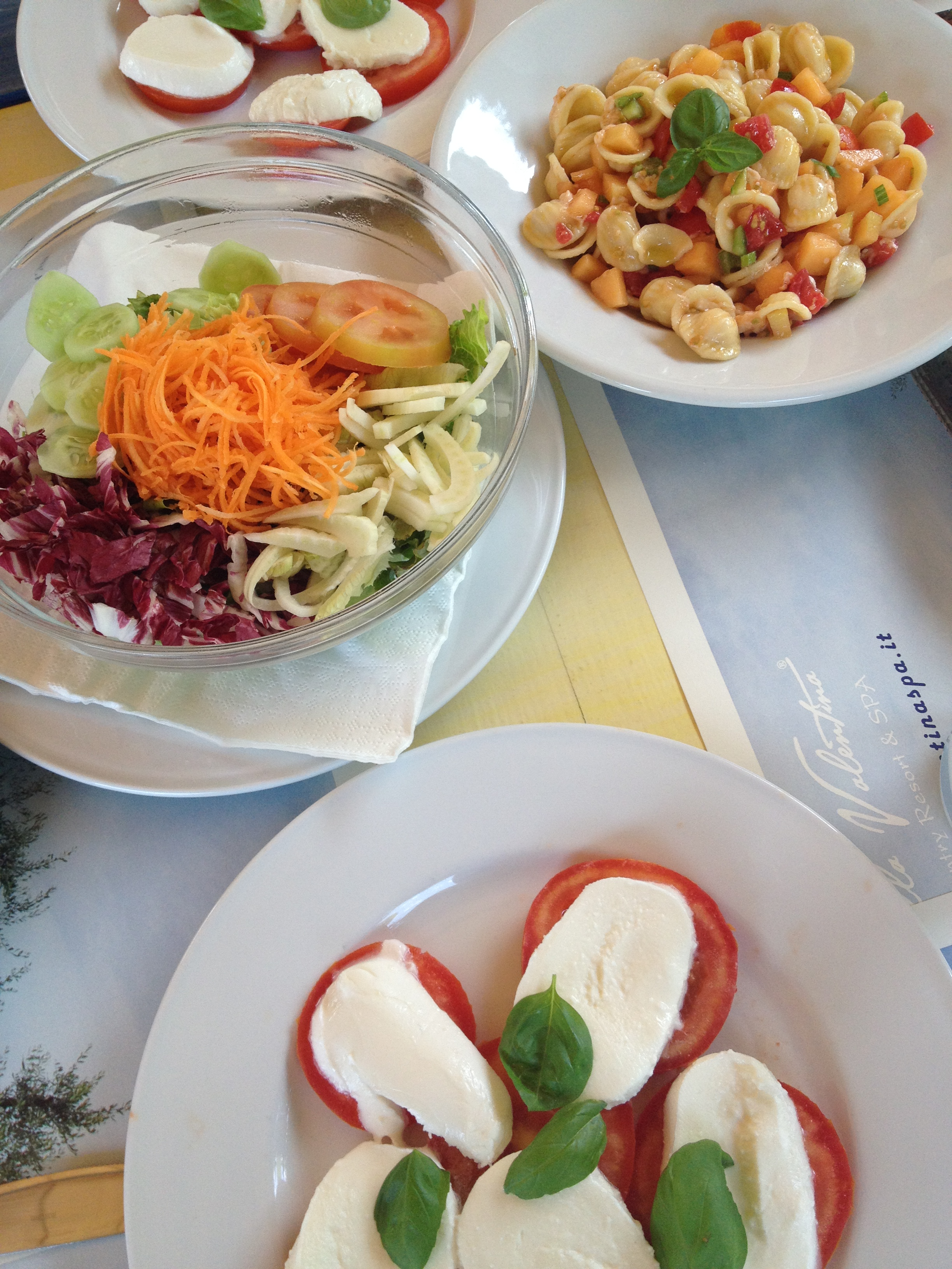 The day before the wedding, the ladies went to a spa, which included among other things, lounging by the pool, massages, and this lovely lunch of salad, pasta with melon and tomato (I know, I was intrigued!), and super fresh caprese salad, all served with fresh bread of course.