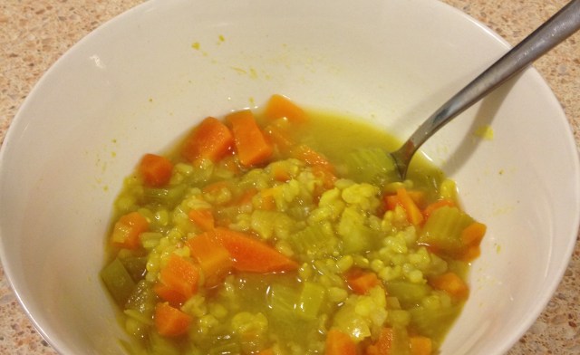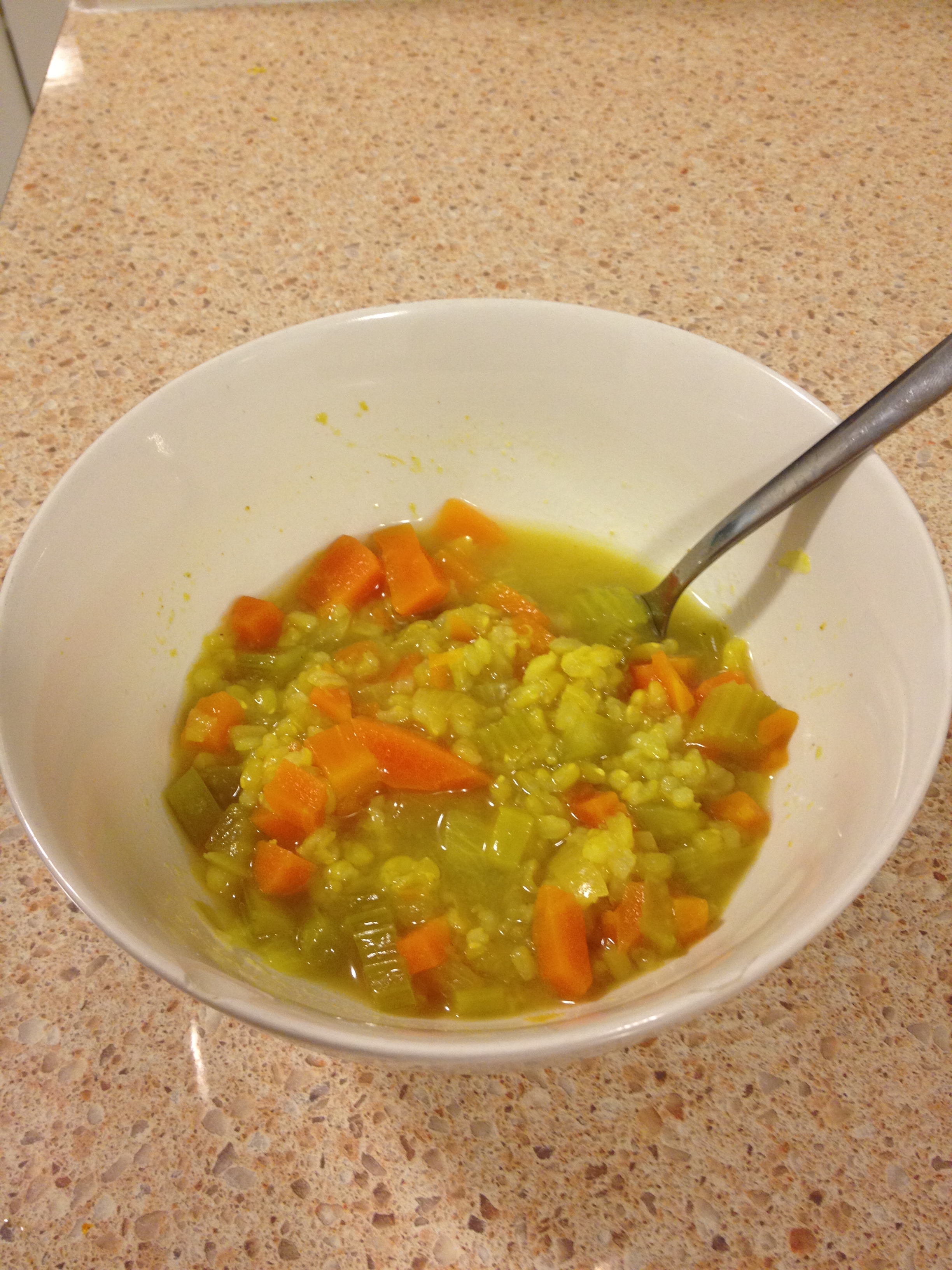 As much as I love to eat out, I do have some limits that I hit eventually, and sometimes it does feel really good to just stay at home and eat a simple bowl of soup with some fruit for dessert. I pre-emptively knew this would be the case when I came back from my two weeks of vacation in Italy followed by mass amounts of drinking/eating in Melbourne, so the weekend before I left, I made a huge batch of this soup and put in the freezer for my return. It was amazing to come back on Sunday and have this soup waiting for me. It’s originally from a mulligatawny soup (a traditional Indian soup) recipe that includes chopped chicken or lamb and adds cream at the end, but I have completely modified it to make it really healthy and vegetarian.