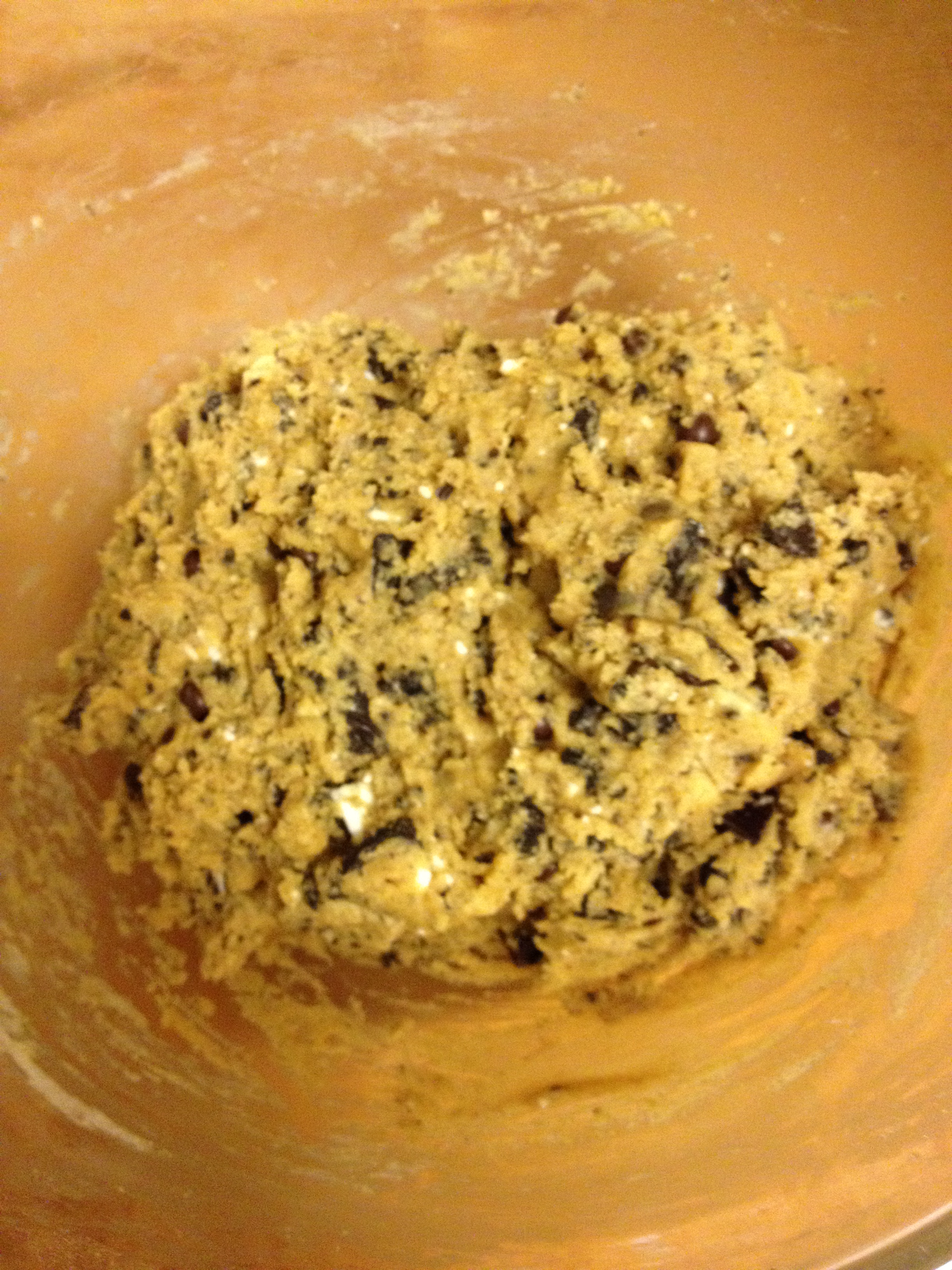 Cream your butter and sugar together till thoroughly combined. Honestly I am very impatient and can’t wait for butter to soften, so I typically just pop it in the microwave for a minute so it’s not fully melted but can easily combine with the sugar. Then add your eggs and vanilla extract and mix till thoroughly combined again. Add the baking soda and salt, and then the flour 1 cup at at time. After 2 cups have been added, pour in your oreos and extra chocolate if you are using it and fold everything in. At this point, add in another half cup of flour, test out the stickiness of the dough, and then add the last half cup. I tend to go by the feel of the dough rather than a specific measurement of flour – you want to be able to pull a piece off, but it doesn’t need to be a solid ball. Obviously, this requires a taste or two of the dough.