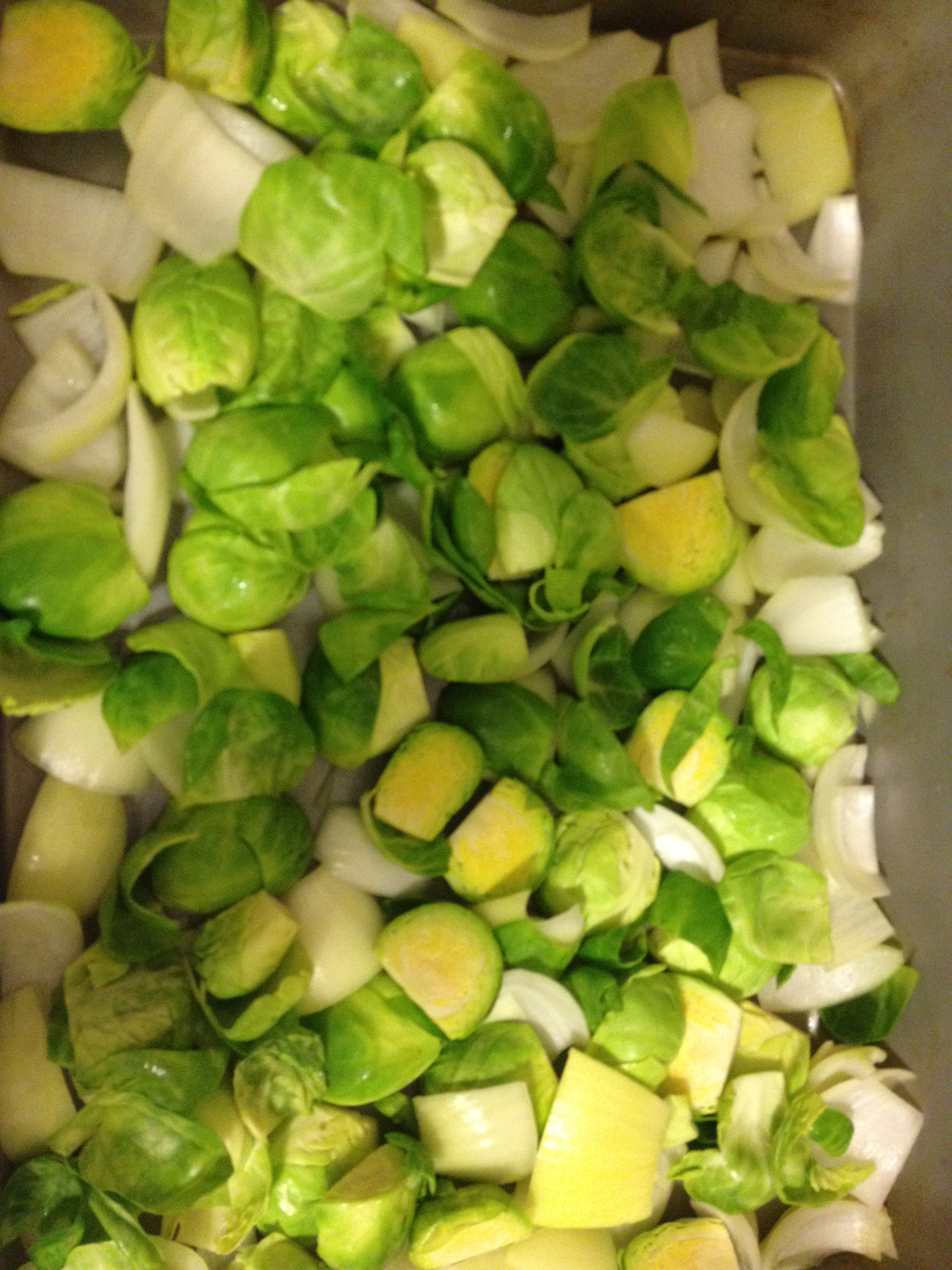 For the onions, chop off the ends, peel away the outer layers, and roughly chop into sections. Then separate all the layers out so there are fairly thin about 1 sq inch pieces. For the brussel sprouts, chop off the ends and discard, then slice in half lengthwise. Often while doing this, some of the outer leaves fall off, which is great – I tend to peel away several layers of the brussel sprouts while cutting them, because these leaves become crispy when roasted and add great texture to the finished dish.