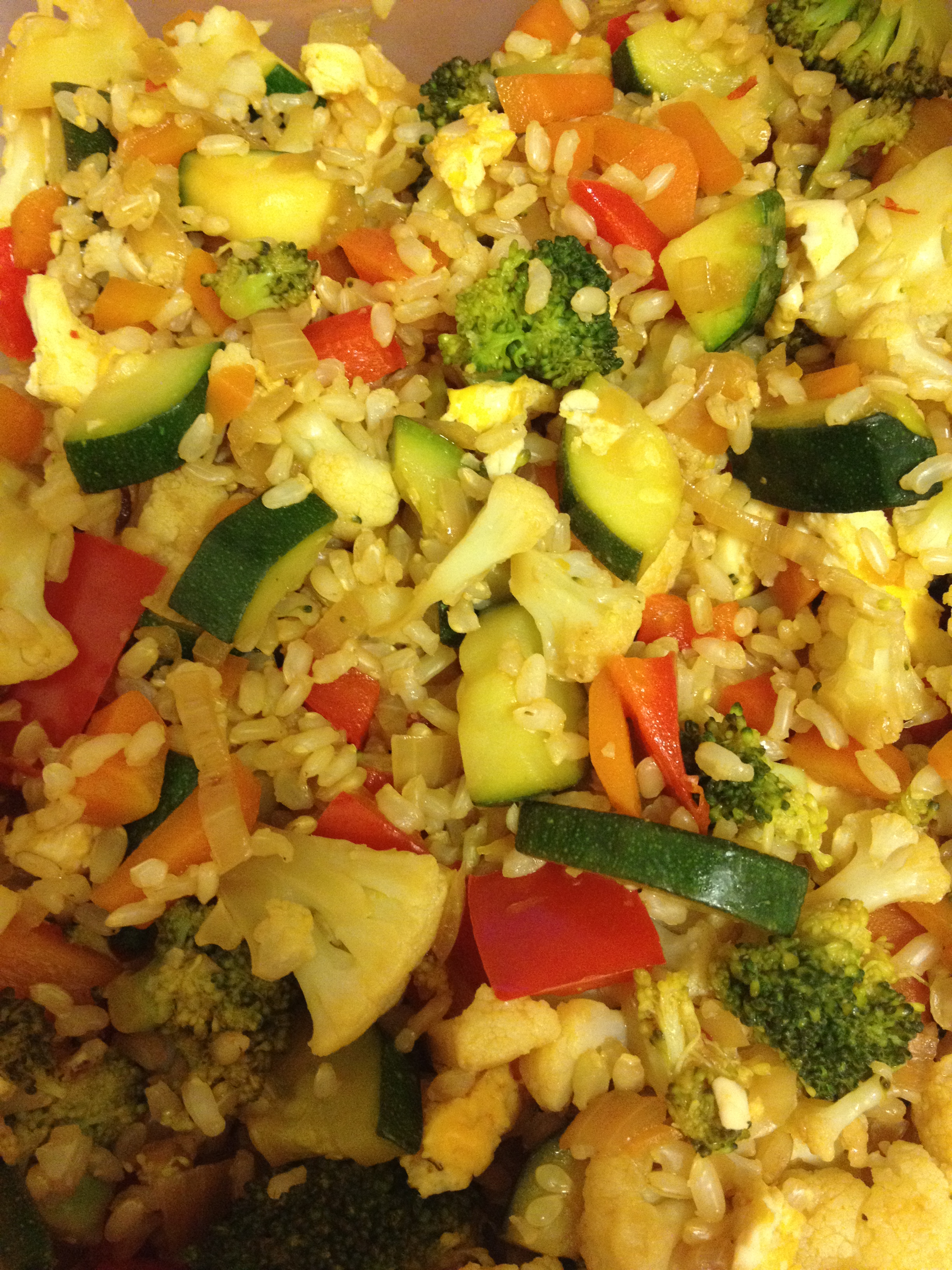 While the brown rice is cooking, prep all your veggies by chopping them into bite size pieces (a fairly large dice).  As always this is the most time consuming part but is totally worth it in the end.  Prepare a big saute pan or a wok by spraying it with non-stick cooking spray.  Add the onions and carrots and turn up to medium-high heat.  Saute, stirring frequently, until they start to soften (about 5 minutes).  Because I cook with essentially no oil, this sometimes makes things stick to the pan more, so often at this stage in the cooking I add a few tablespoons of water just so they can steam slightly and won’t stick and turn black (not a good look).  Then add veggies in the following order: broccoli/cauliflower and green beans, followed by zucchini and any capsicums.  Wait a few minutes in between adding vegetables as obviously the earlier vegetables take several minutes longer to cook than the later ones.  Stir this frequently/continuously – you can never stir enough with stir fried dishes, so go nuts.