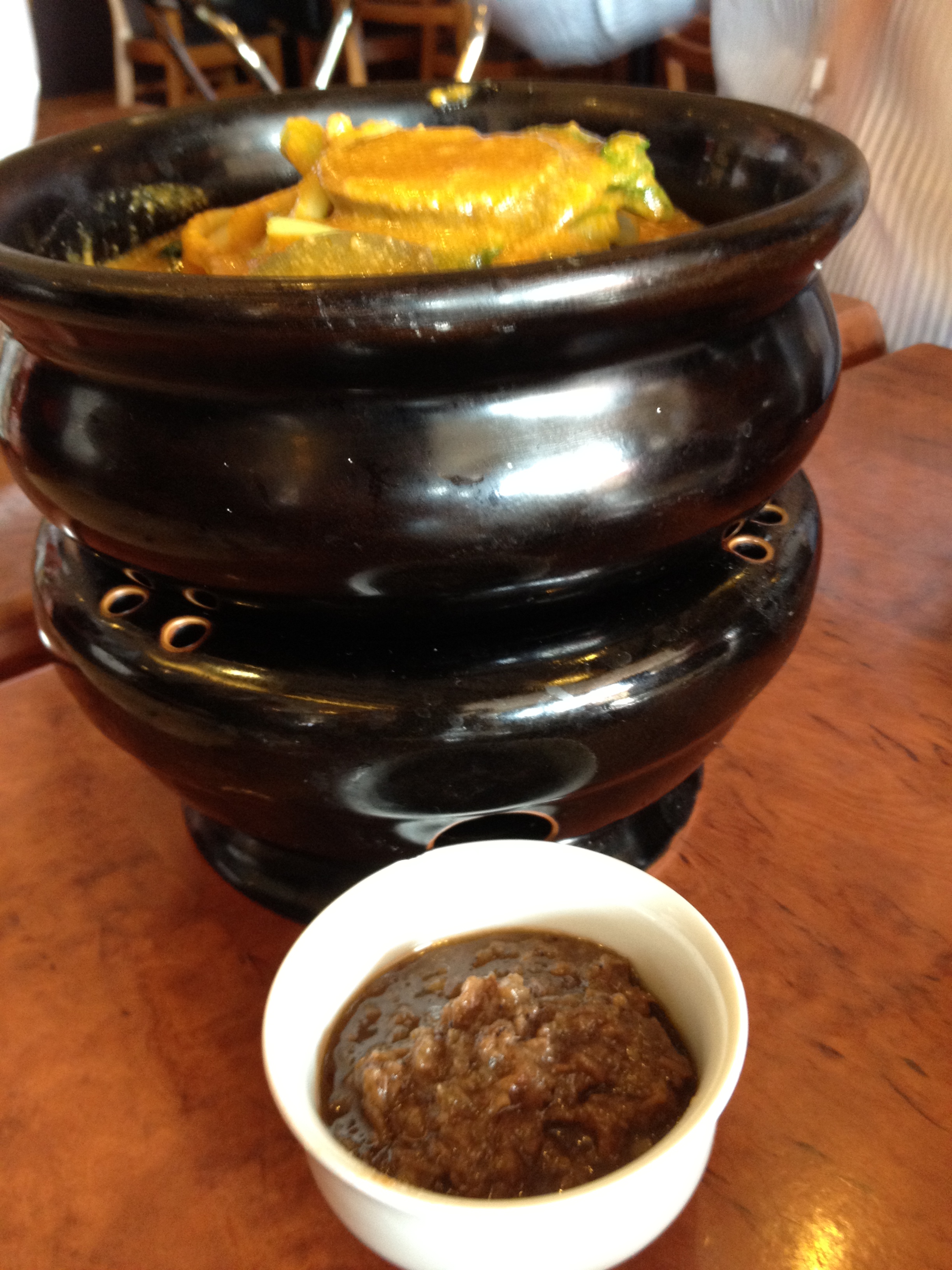This delightful little stew pot is full of kare kare, which is a traditional Filipino stew made with a peanut sauce, a few vegetables (yay!), oxtail (oh no), beef, and some tripe (double oh no). It’s served with a super salty shrimp paste and then you of course put it over tons of rice. Goodbye, my health. I actually really enjoyed the sauce and the veggies…the meat, not so much my thing… although I did bravely try some oxtail.
