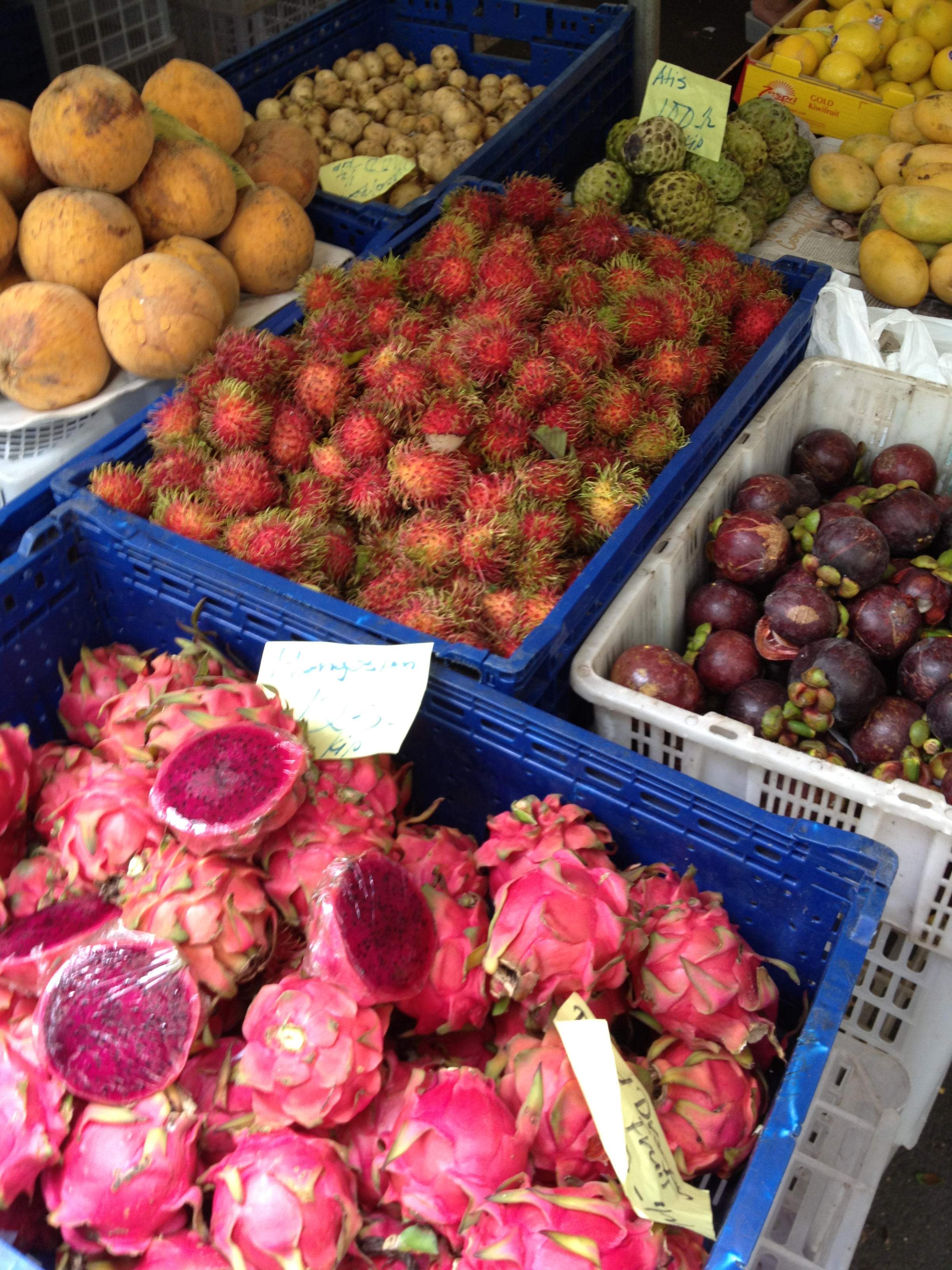 Some of the many fascinating tropical fruits. I can’t name all of them, but the purple ones on the right are MANGOSTEENS (which do not taste at all like mangoes), an insanely cool fruit that I can’t really describe except to say it has a cult following. I just love how funky and quirky all tropical fruits look.