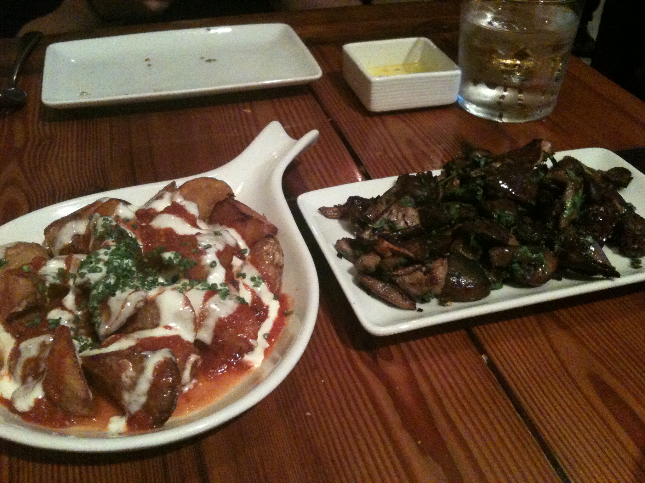 Patatas bravas (oh fried potatoes, why are you so good) on the left and roasted mushrooms on the right