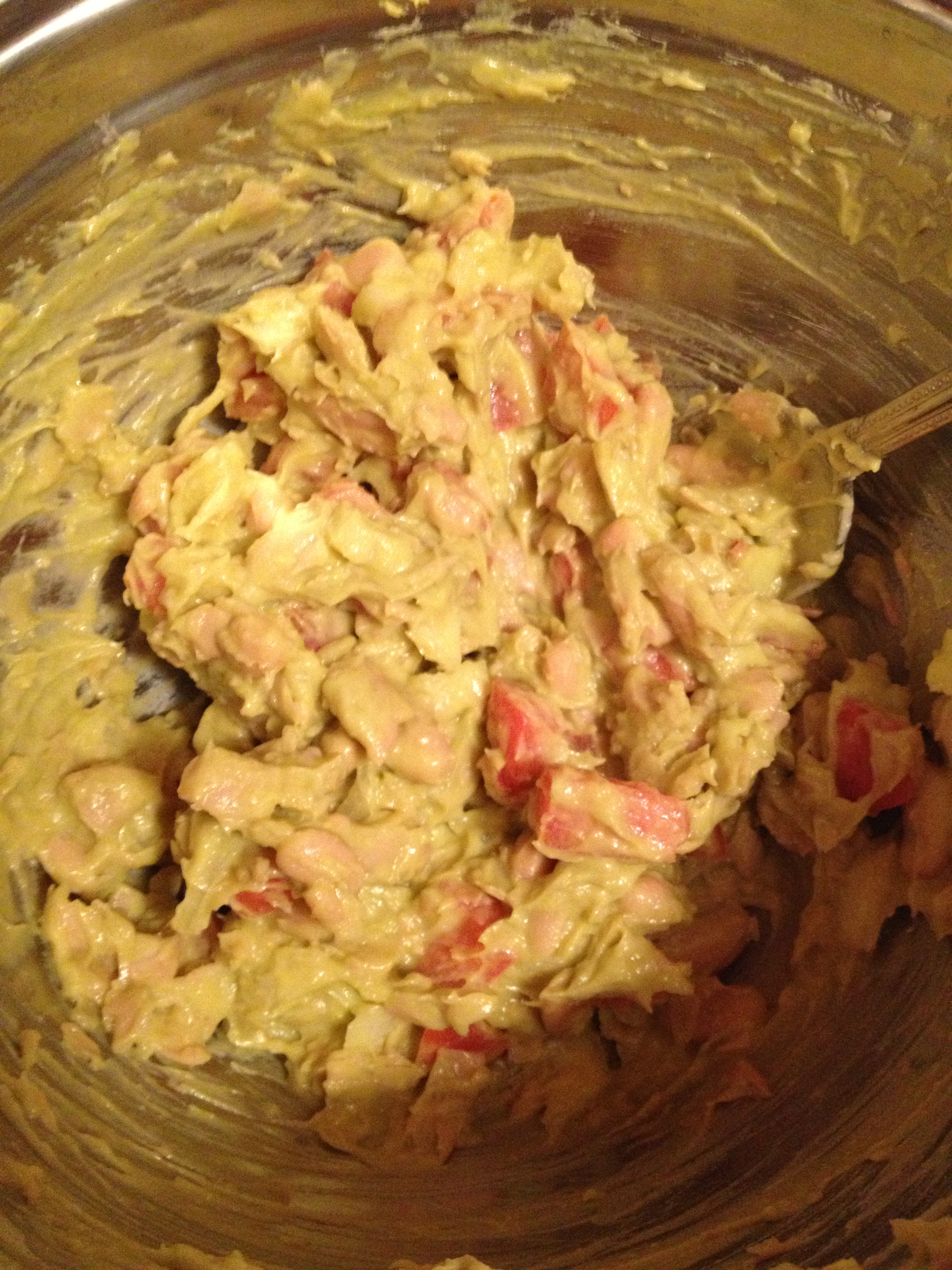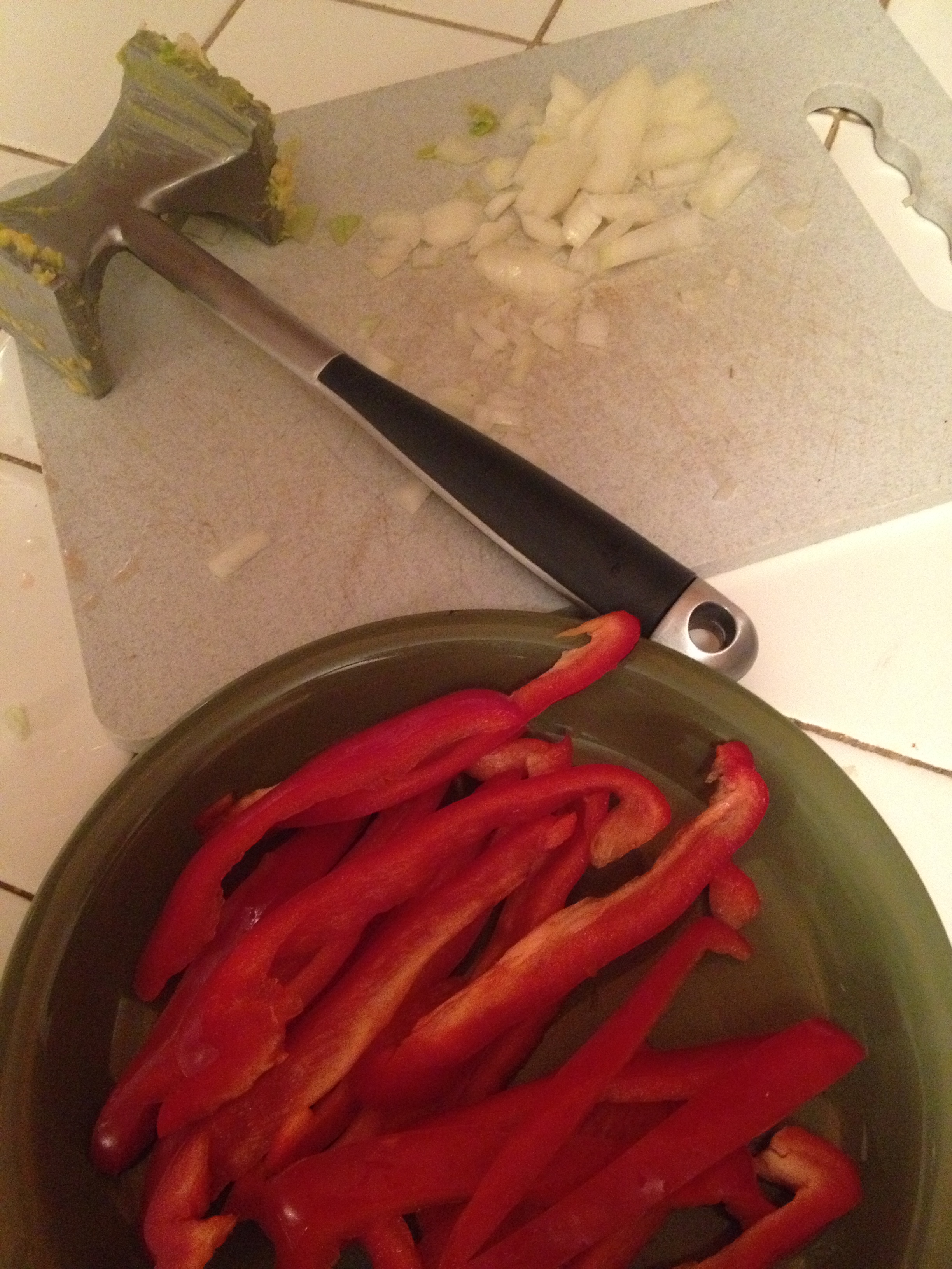 As you can see, we really only had a meat tenderizer. So this is what was used to smash up the beans. We cut red pepper strips for dipping as well