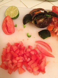 Work in progress shot: discarded avocado skins and chopped up tomatoes