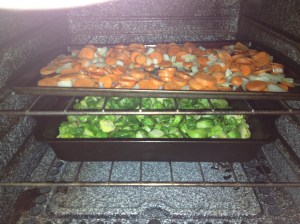 See my previous post on roasting vegetables for some more details on what to do with your bounty. Basically, always keep carrots and onions separate from the rest since they take longer. I did carrots and onions in one pan, brussels in another, and the remaining vegetables in a third. When they came out of the oven I drizzled with olive oil, added salt and pepper, and tossed with the greens. It’s really that simple – just takes a bit of time for the prep work.