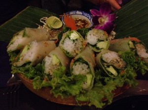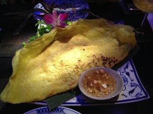 AWESOME Cambodian crepe, filled with a mixture of minced chicken and shrimp. The way they presented everything was wonderful as well – simple, but pretty, with lots of orchids as decoration.