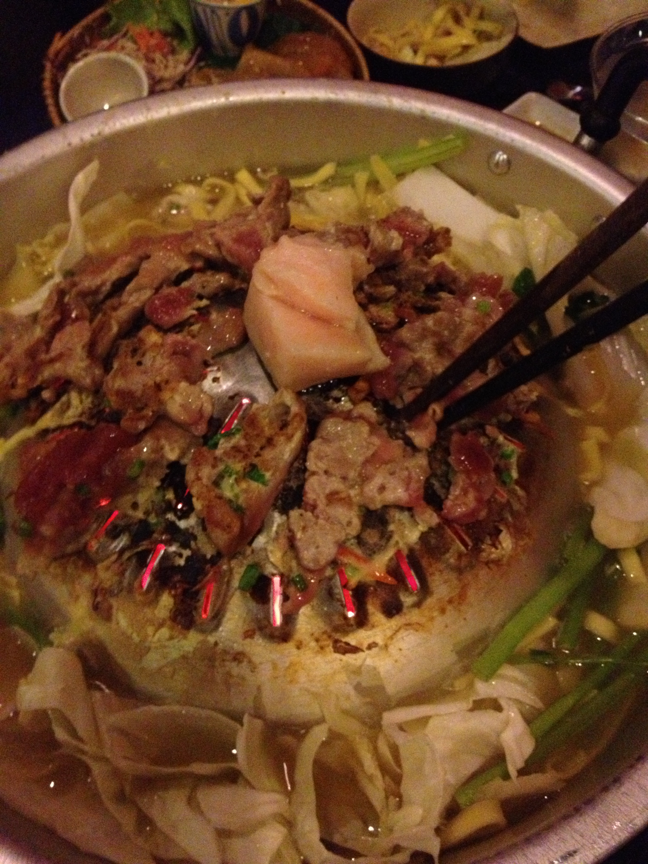 You cook the meat yourselves and they put hot broth in the outside of the meat cooker where you can then cook noodles and vegetables that they give you. It’s a pretty fun marriage of Korean barbeque and Japanese hot pot. Way to go Cambodians – you really know how to cater to your tourists.