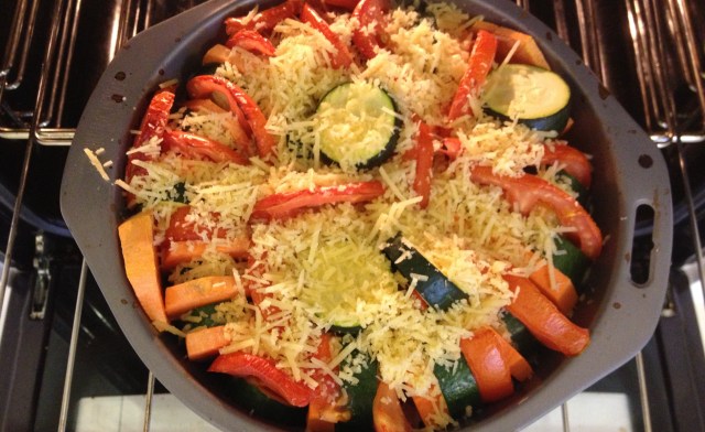 Preheat the oven to 375 F / 190 C. Coat a round baking dish with olive oil cooking spray. (You can use a square baking dish if you don’t have a round one – you just have to get creative with your vegetable arrangement.) Spray a skillet with cooking spray (or use a tsp of olive oil) and saute the diced onions and garlic on medium heat until soft and translucent. Spread the onion mixture on the bottom of the greased baking dish. Slice the potatoes, zucchini, and tomatoes in 1/4 inch thick slices. (I slice the tomatoes a bit thicker than the potato, since the potato will cook more slowly.) It’ s a bit tricky to get equal numbers of the various vegetables, but think of it as a fun challenge. Layer them alternately in the dish on top of the onions, fitting them tightly into a spiral, making only one layer. Season with sea salt, black pepper and dried thyme, to taste. Drizzle a bit of olive oil over the top if desired.