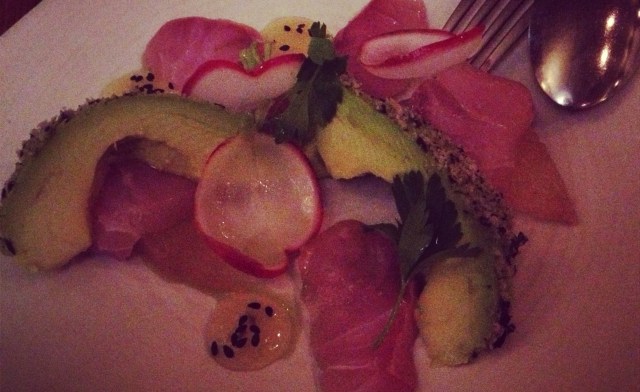 Kingfish sashimi with avocado encrusted with salt and pepper, radishes, and dashi pear. The avocado especially was unbelievably good – amazing what the addition of the salt and pepper did. Taking one bite with the avocado and sashimi together was heaven in my mouth.