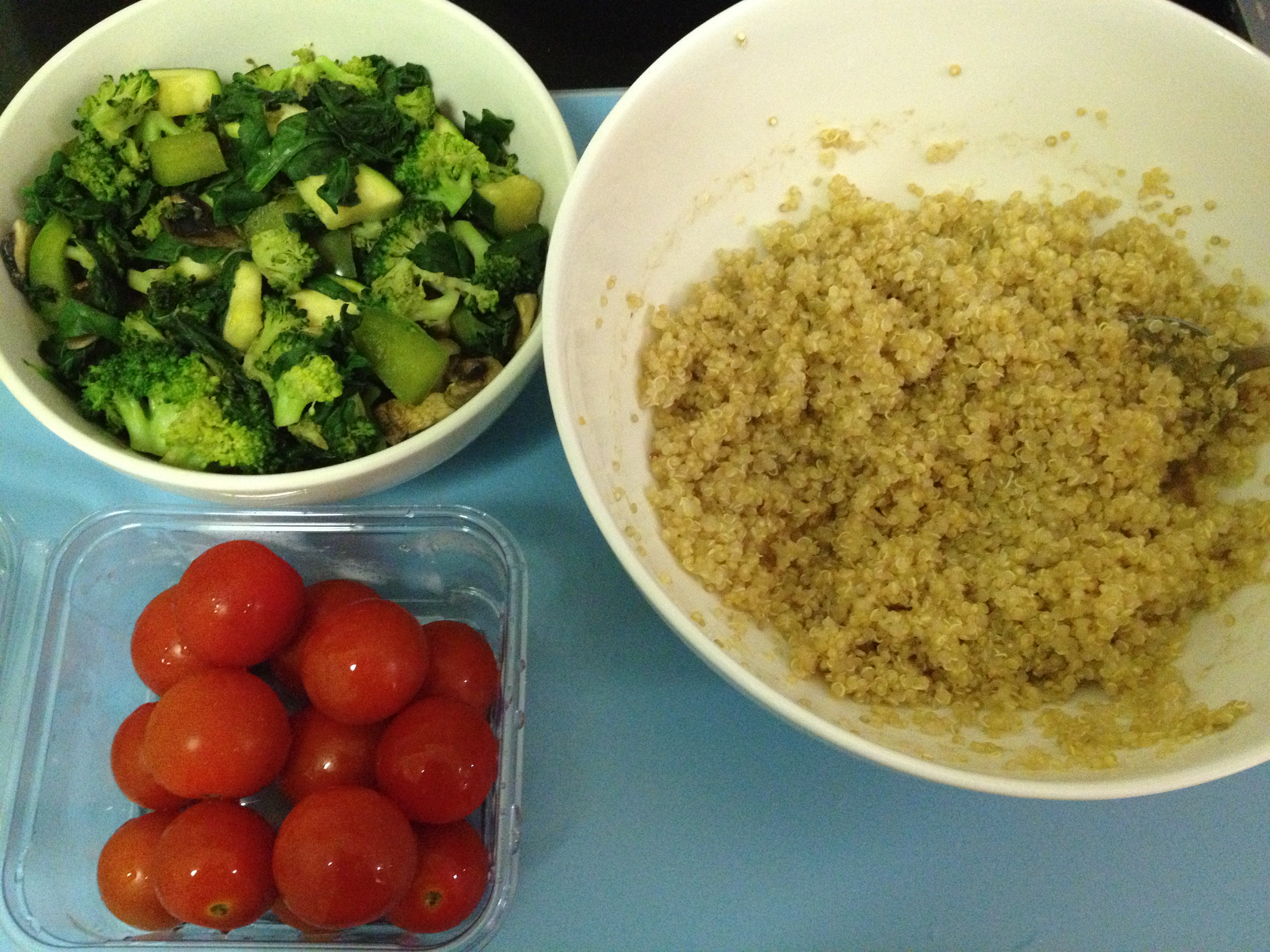 While the quinoa is cooking, add some oil to a frying pan and saute the onions and garlic until soft and fragrant. I then added some broccoli and zucchini I had leftover from other dishes. You can really just stir fry whatever veggies you want here. Regardless, add the spinach/kale and mushrooms last and stir until the spinach has just wilted. Set aside to cool.