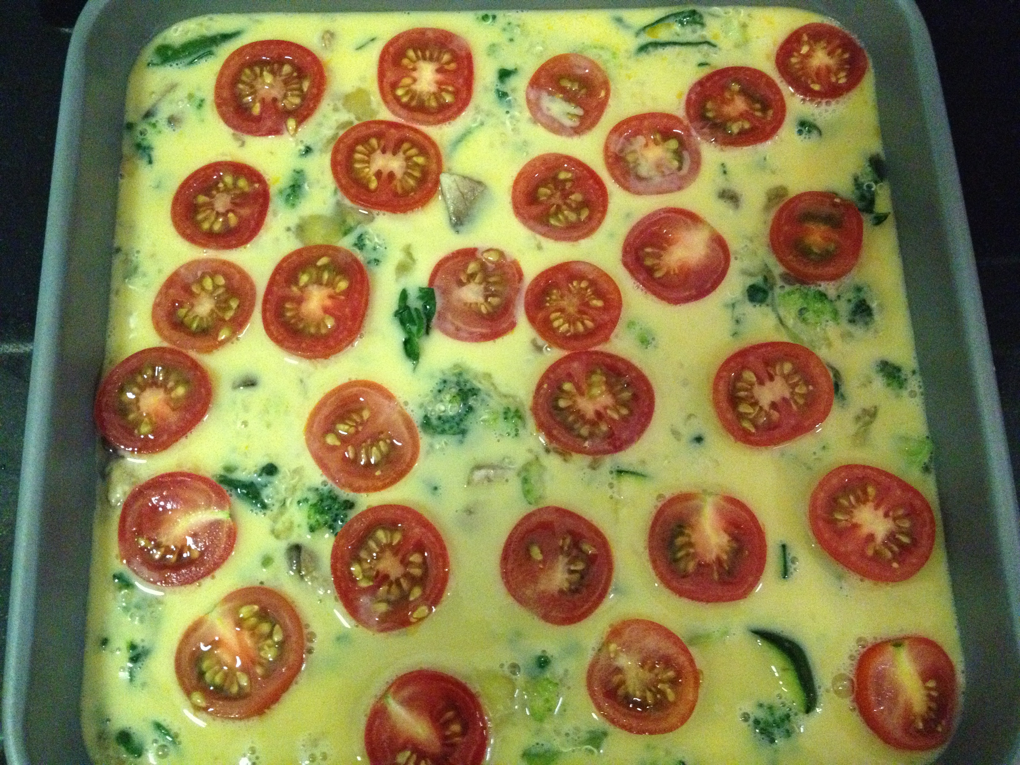 Carefully place the cherry tomatoes seed side up all over the top of the quiche and place it in the oven. Cook for approximately 45 minutes until golden.