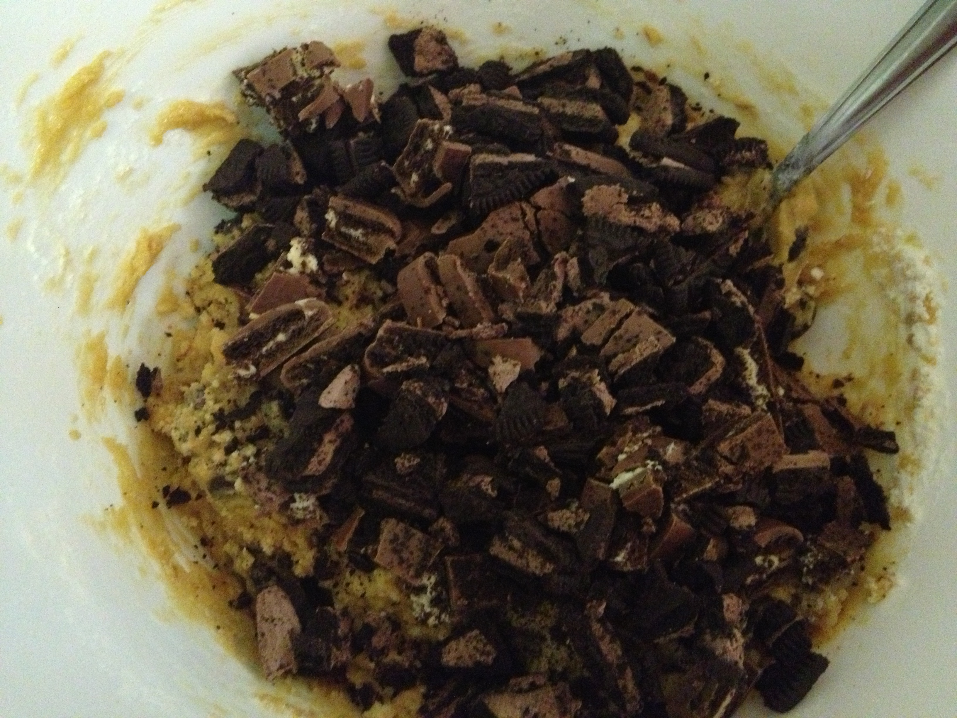 My favourite part of the whole process – adding in those delicious crushed cookies after adding some flour