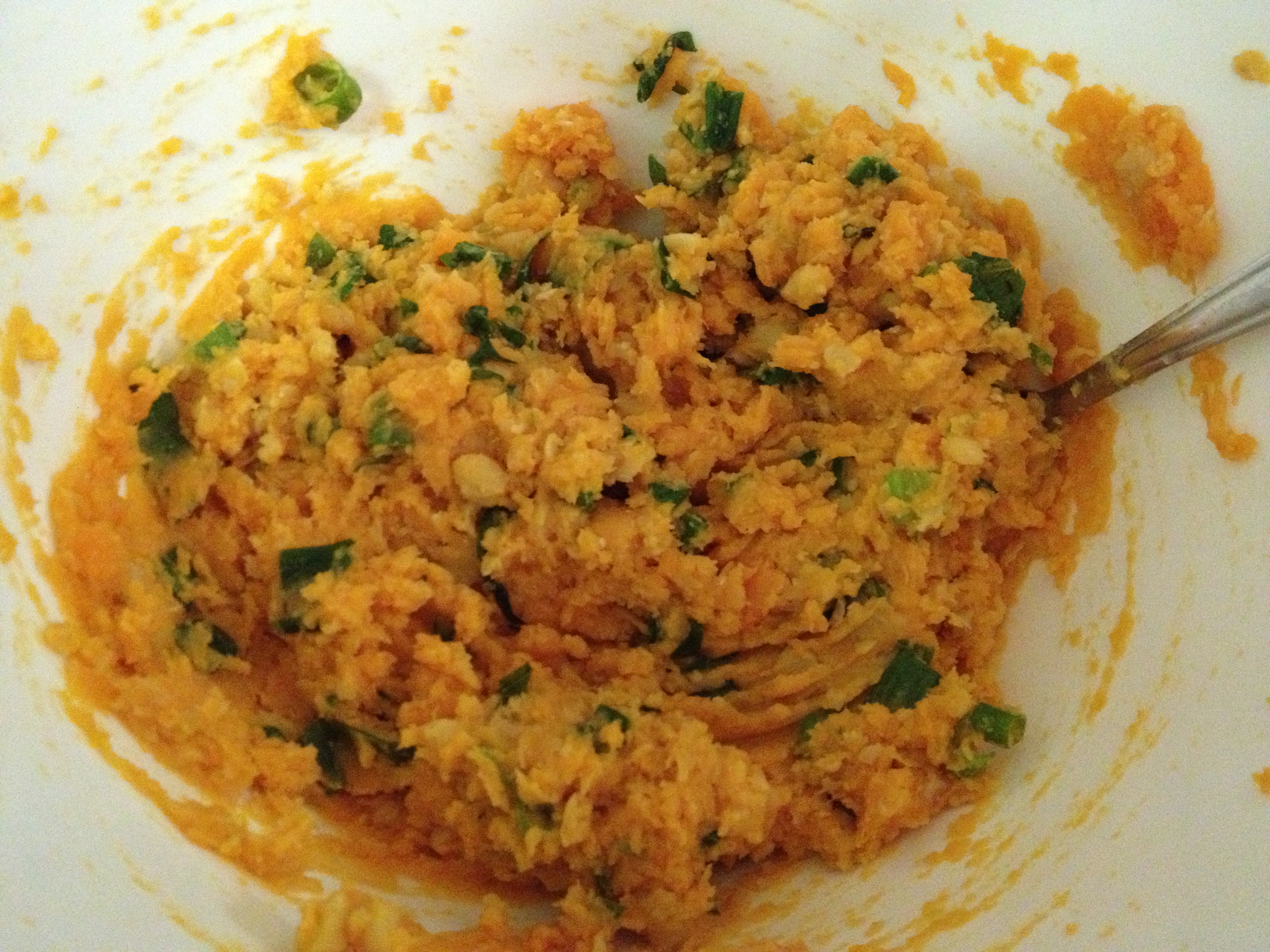 Cook sweet potatoes in boiling water until soft. Drain and transfer to a bowl. In a blender (I just have a tiny one), puree the chickpeas. If you have a big food processor, you can put in the all the ingredients up to the flour, but I mixed everything in a bowl and only pureed the chickpeas. Make sure to mash everything very well if you’re mixing by hand – I used a potato masher.