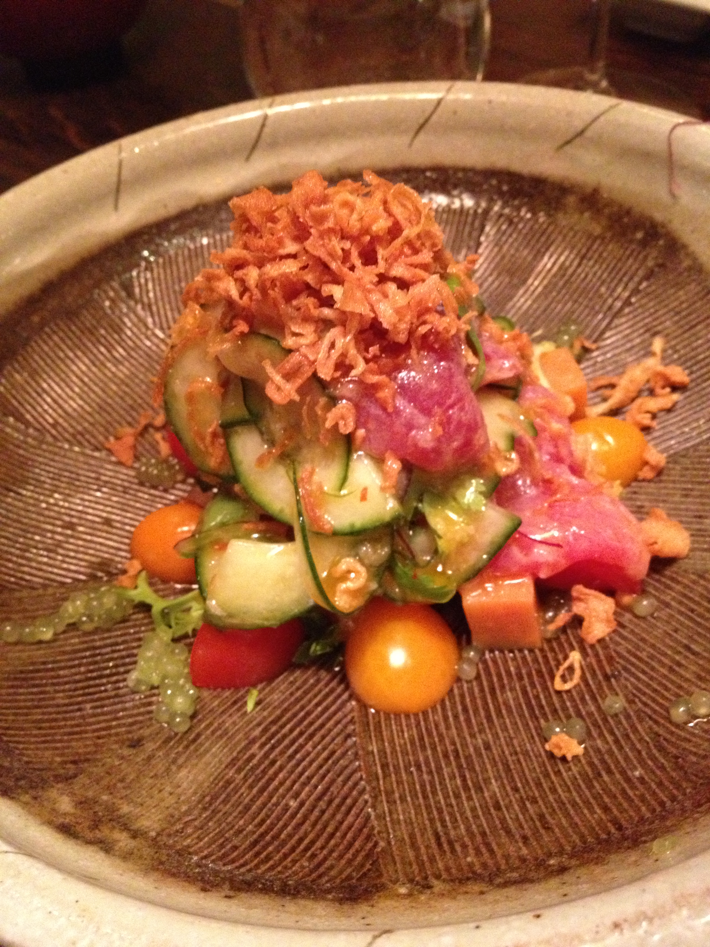 Fantastic tuna ceviche with really fresh cherry tomatoes and cucumber and fried onions on top. Loved the citrus dressing and the different textures here – this was probably my favourite dish