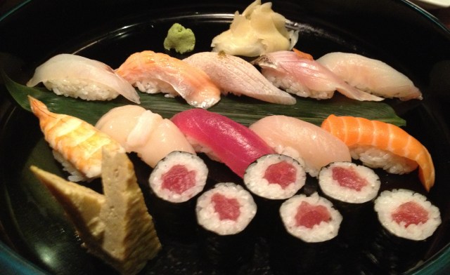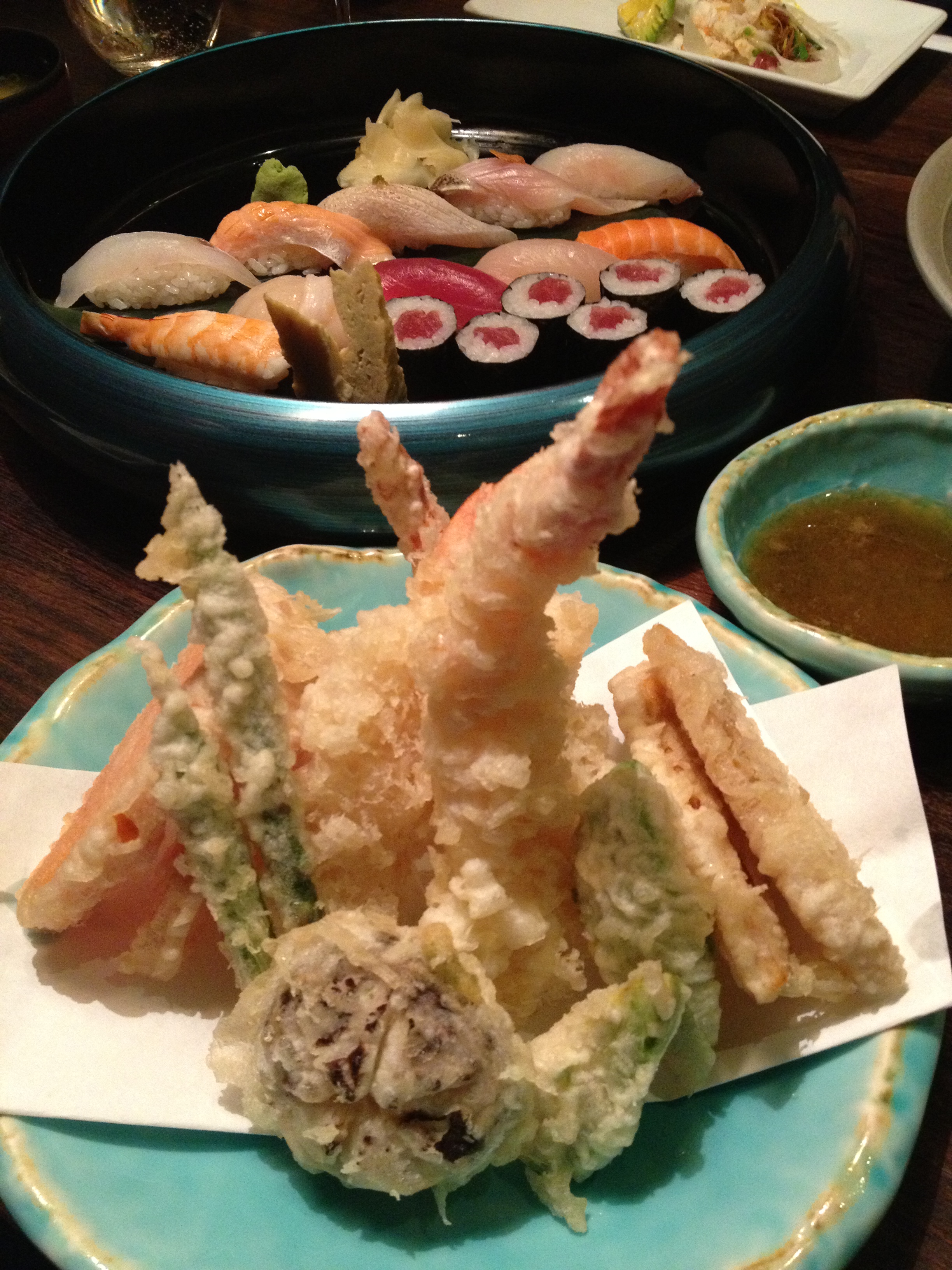 Tempura in the front and a sushi platter in the back with tuna rolls and various fish. The tempura included avocado which I found slightly odd but rather pleasant.