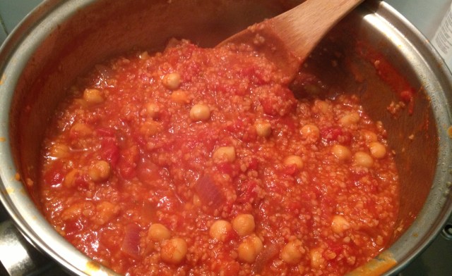 I realise it’s getting warmer in America, but it’s getting colder in Australia and thus I am craving soup more often. In addition to tasting great in many applications, chickpeas are also a fantastic add to a soup. This soup is rich and filling while remaining incredibly healthy. It would be great with a side of green vegetables. The original recipe called for quinoa but I’d been using so much quinoa recently that I decided to substitute in bulgur, which also worked very well. (For those of you who don’t know, bulgur is what it used in tabbouleh and is another high protein grain.) You could probably use brown rice as well.