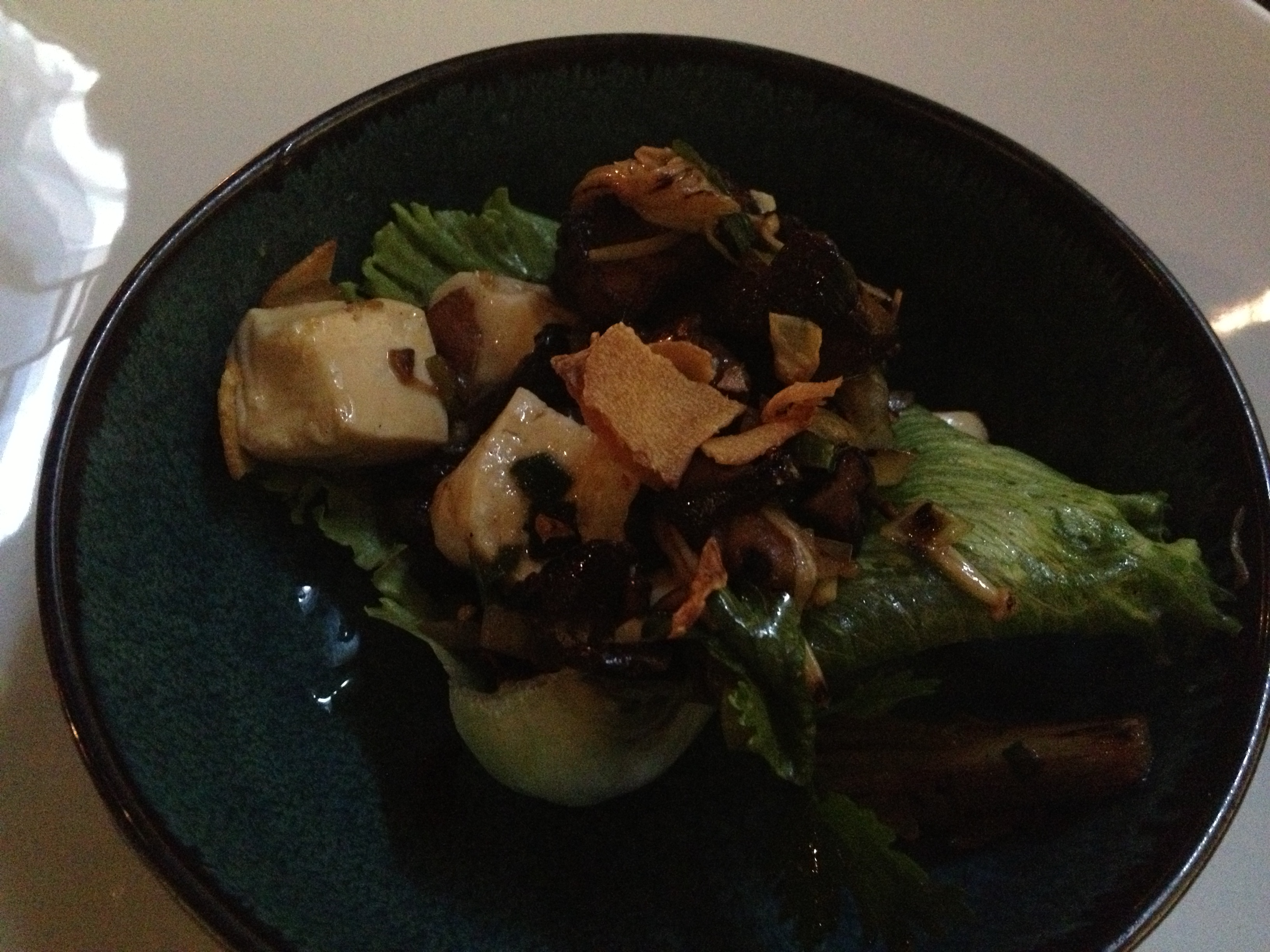 Eggplant and tofu lettuce cup with enoki mushroom, crispy garlic and black vinegar. A little messy but amazing