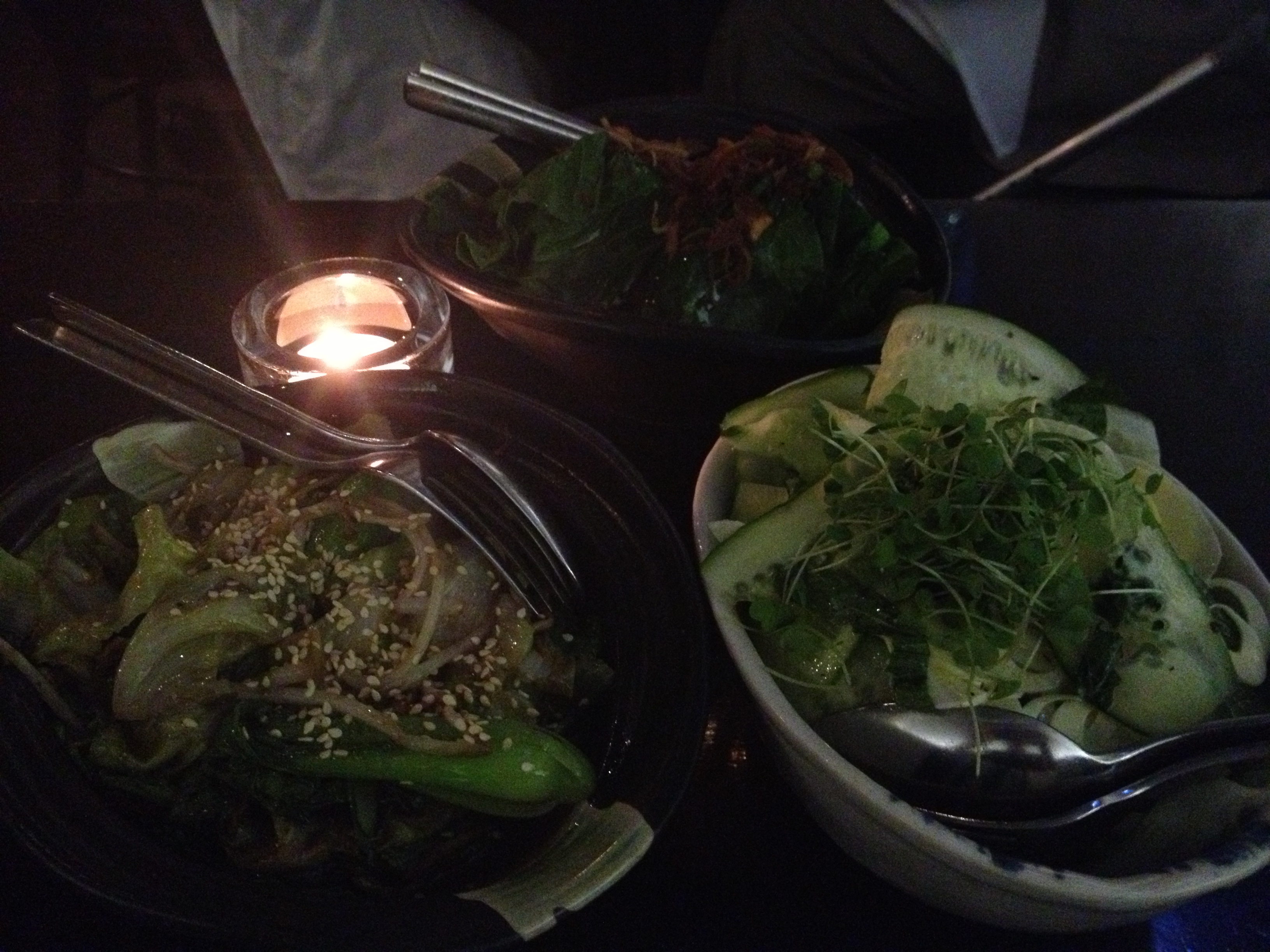From the back going clockwise, steamed gai lan with yellow soy bean sauce, a heart of palm, honeydew melon,and mint cucumber salad, and wok fried bok choy and lettuce with garlic and ginger. My favourite was probably the bok choy but I thought the combination of melon and cucumber in the salad was quite innovative and refreshing