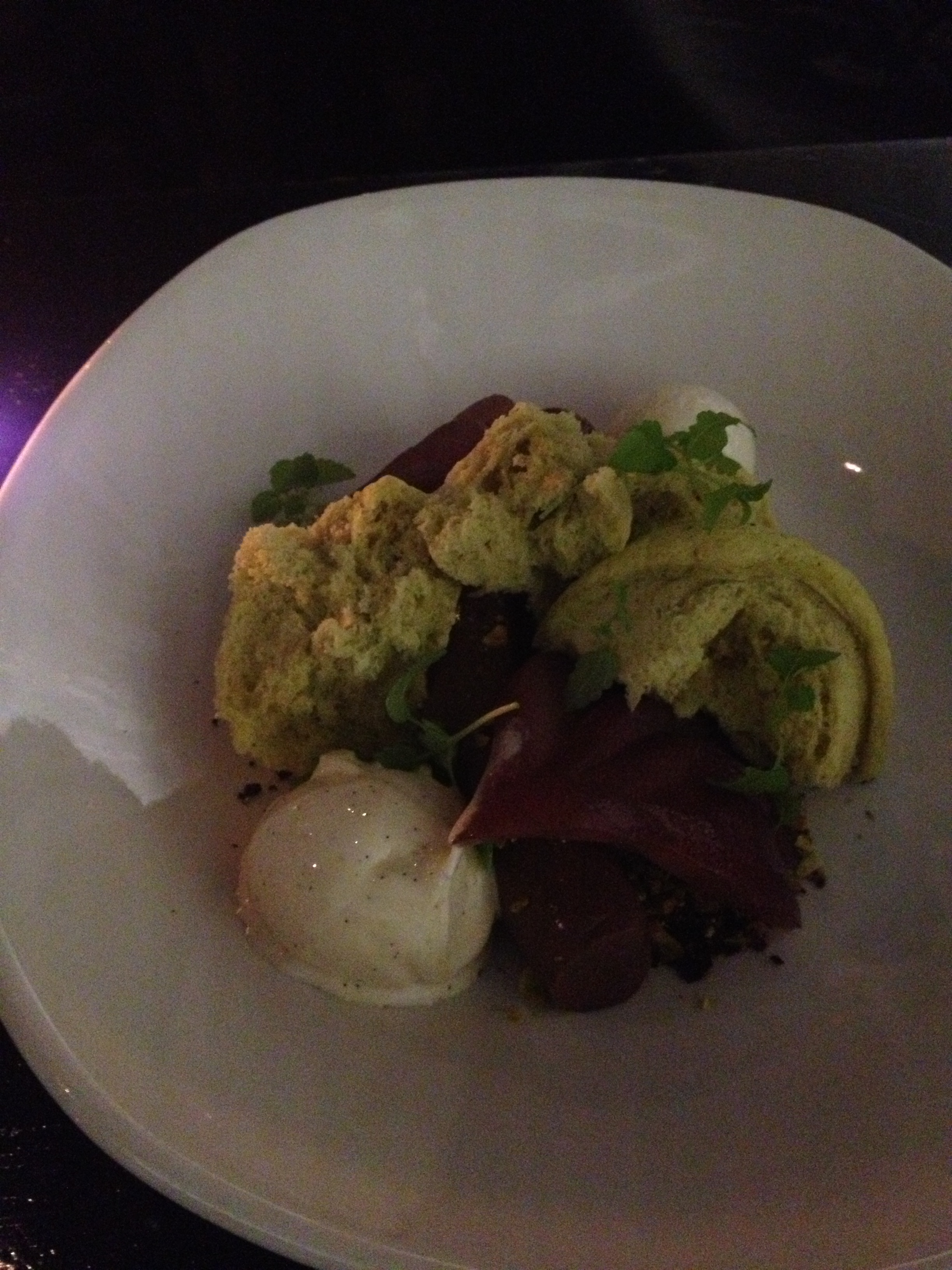 Soft chocolate ganache, pistachio sponge, red wine cherries, cherry sorbet and vanilla bean ice-cream. I loved how light the sponge was but I did wish the chocolate was a bit darker. Also loved taking a little bite of everything together.