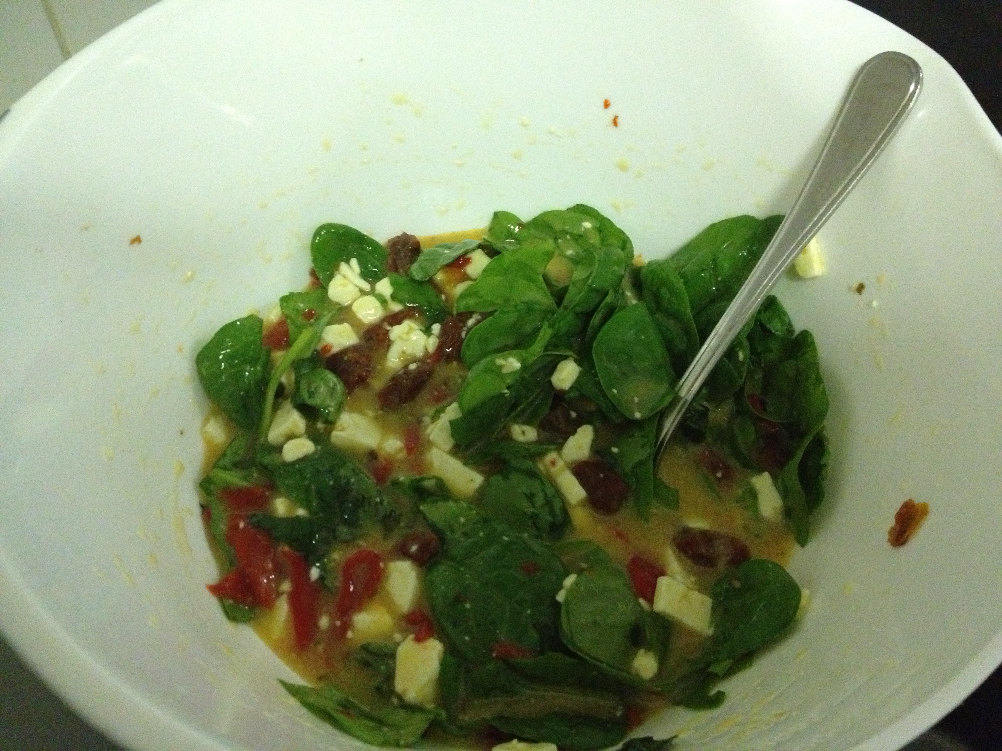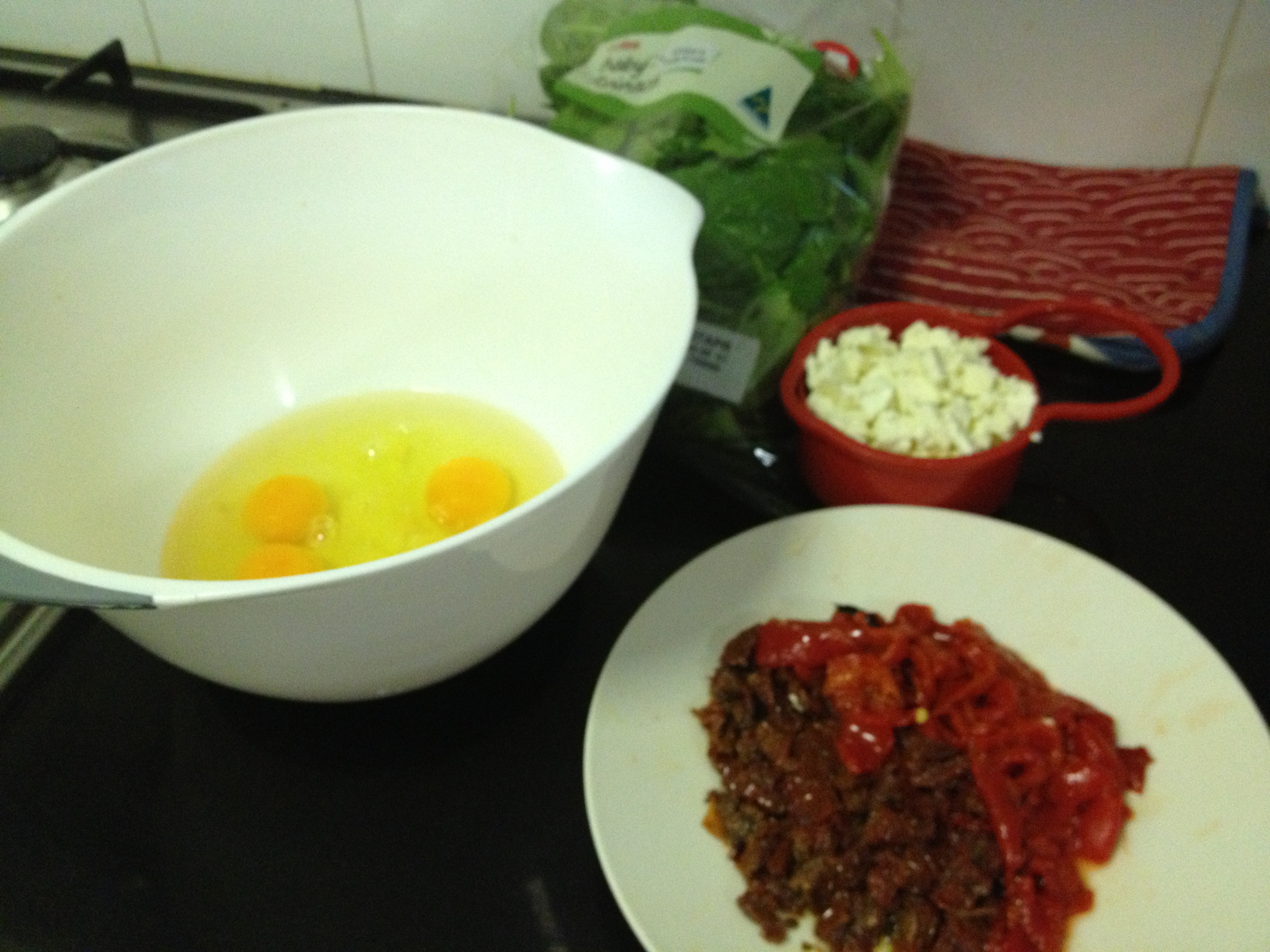 Ingredients ready to go – eggs, spinach, feta, and the sundried tomatoes and peppers