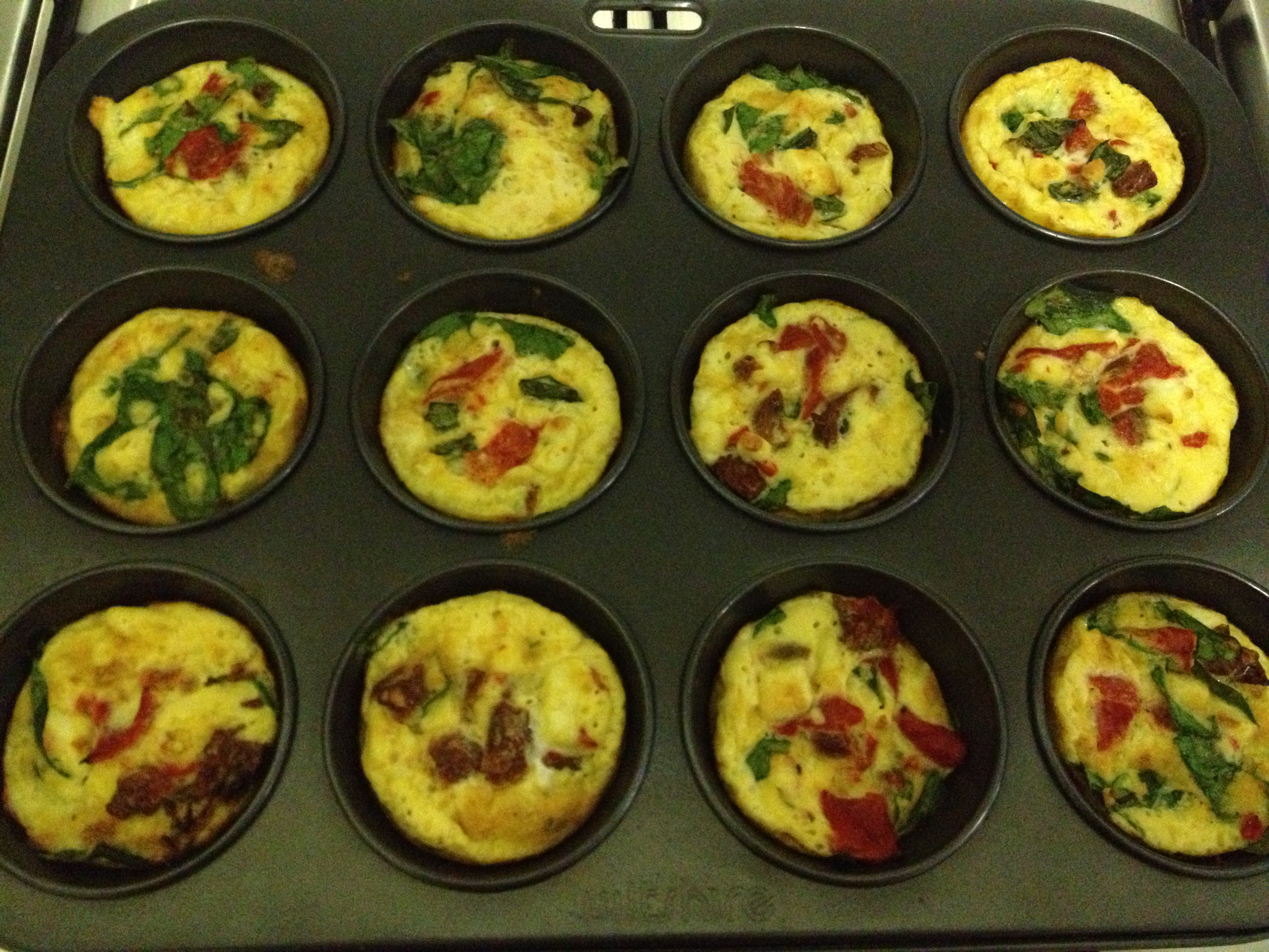 Preheat oven to 180 C / 350 F. Coat one 12-hole muffin pan with cooking spray. In a medium bowl, beat eggs, egg whites, and a bit of salt and pepper until blended. Stir in spinach, sun dried tomatoes, feta, and roasted peppers; mix well. Spoon a bit of the mixture into each prepared muffin hole. I just put about a spoonful in each one and then would add to it to make sure they were evenly distributed.