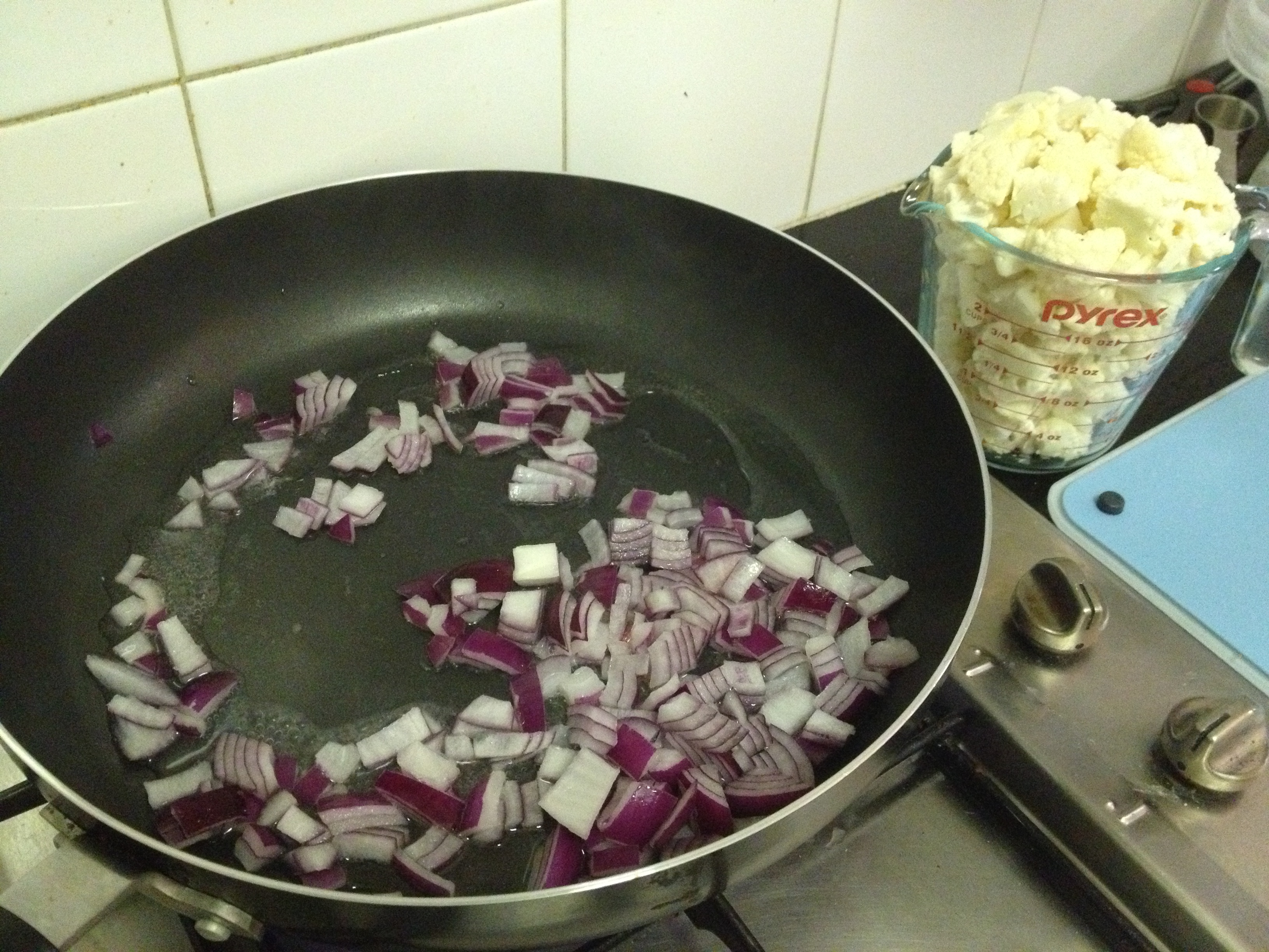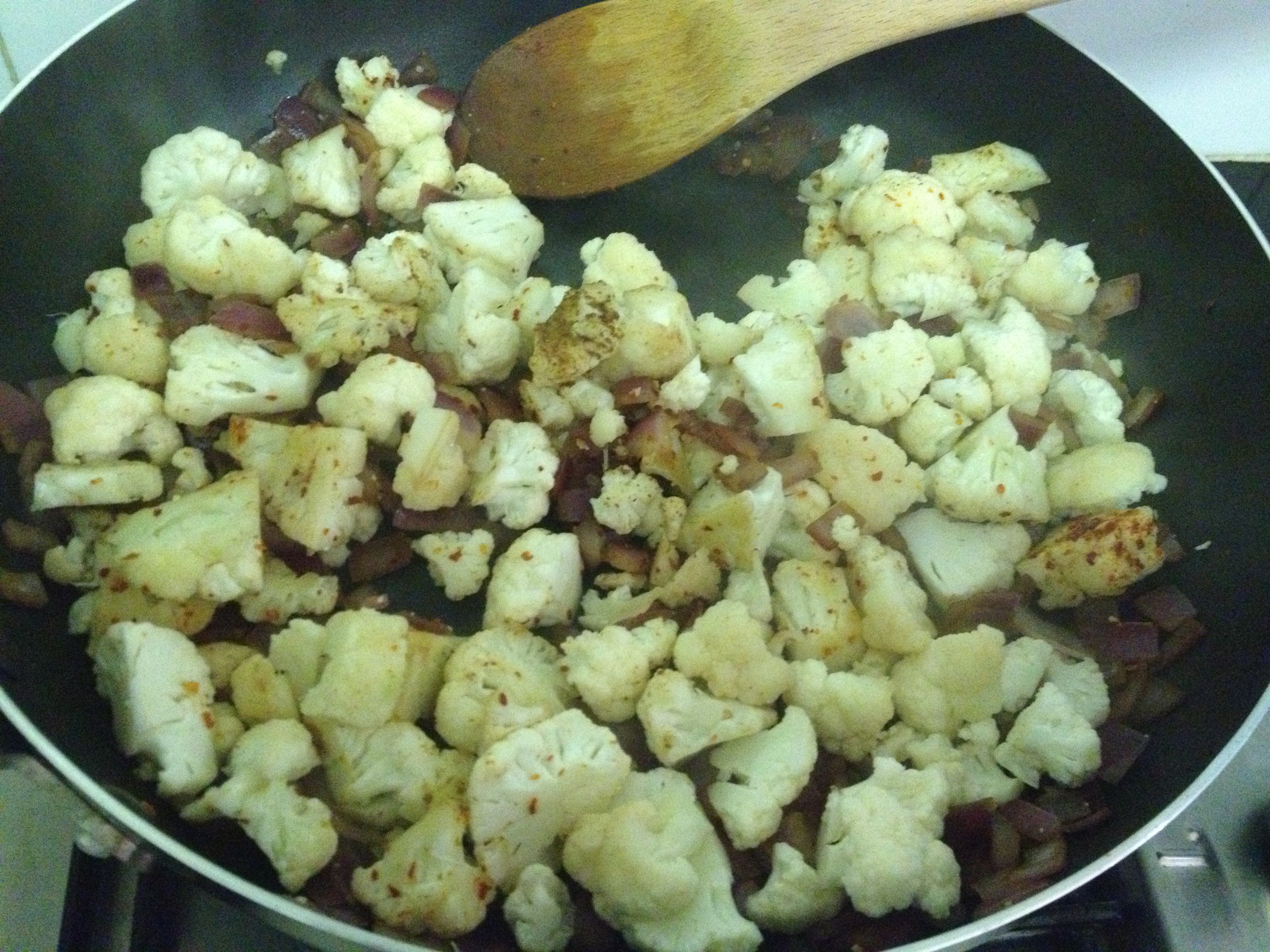 Once the onion has softened, add in the cauliflower, turmeric, chili powder, cumin powder, a bit of salt, and some water. (I basically added in several splashes…you don’t want a lot, but just enough to ensure everything isn’t sticking – and the steam will help cook the cauliflower.) Continue to keep an eye on it and stir frequently until the cauliflower begins to soften as well. Super crunchy cauliflower has no place in this dish.