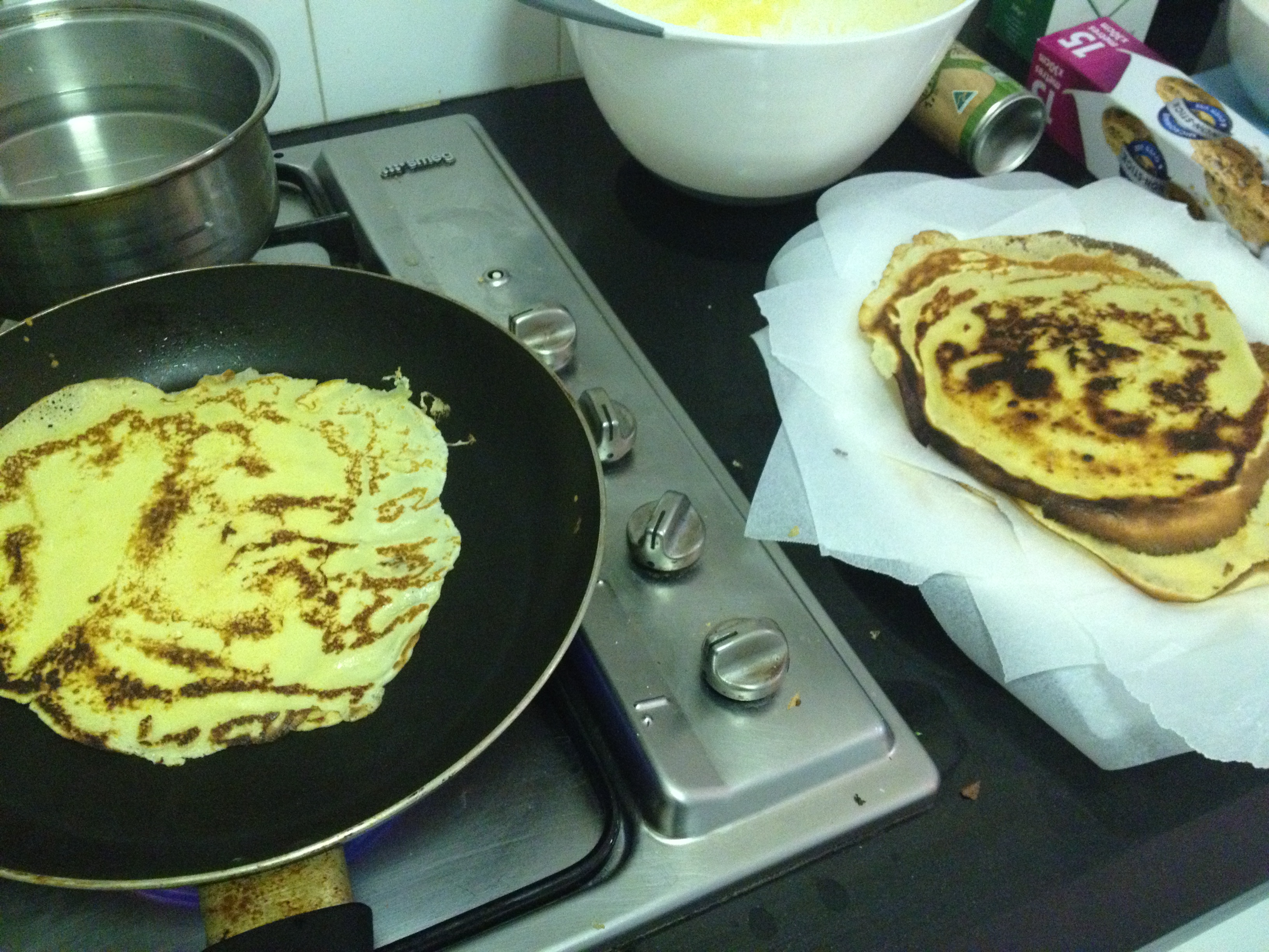 The crepe making process – as you can see, it involves a lot of baking paper. My pan was just a bit too big, but ideally you should get a pan where you can spread the crepe all the way to the edges