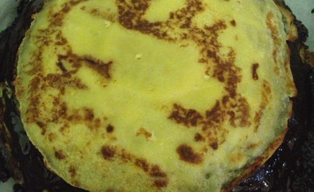 If you want to soldier on, then line the base of a circular spring-form cake tin with a round of baking paper. If you sadly do not possess a circular spring-form cake tin (which I actually don’t at the moment), you can just put it in a square pan. Put one crepe on the bottom. Spread with a layer of ganache, top with another crepe, and repeat the layering process of crepe ganache crepe etc until all the crepes are used. (I think I may have only had 10 or so? The thinner they are the more there will be.) Finish the stack with a crepe. There should be ganache left over that you will use later. Put in the fridge to set for about an hour.