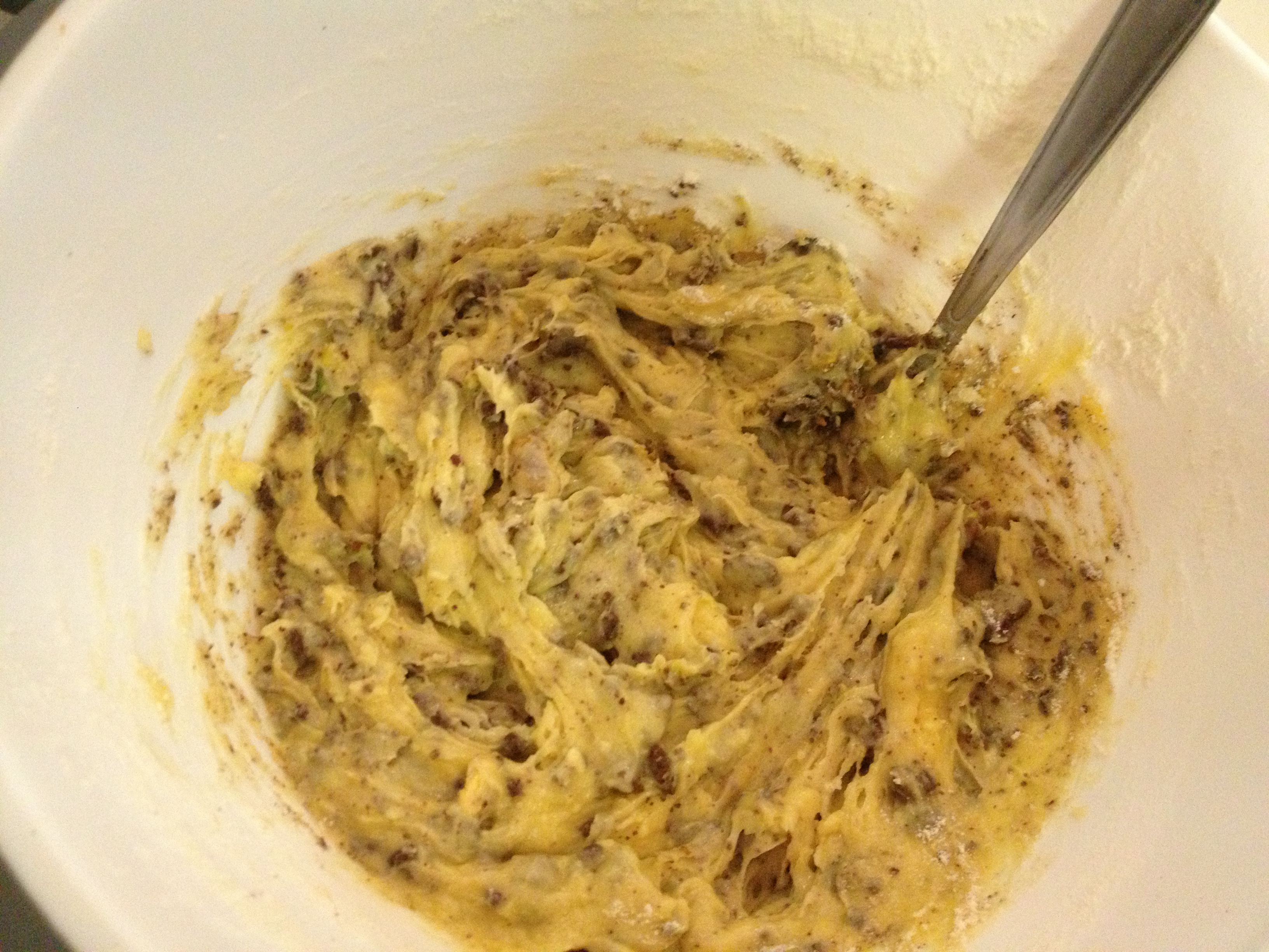 Mixing the dark chocolate and pistachio pieces into the batter