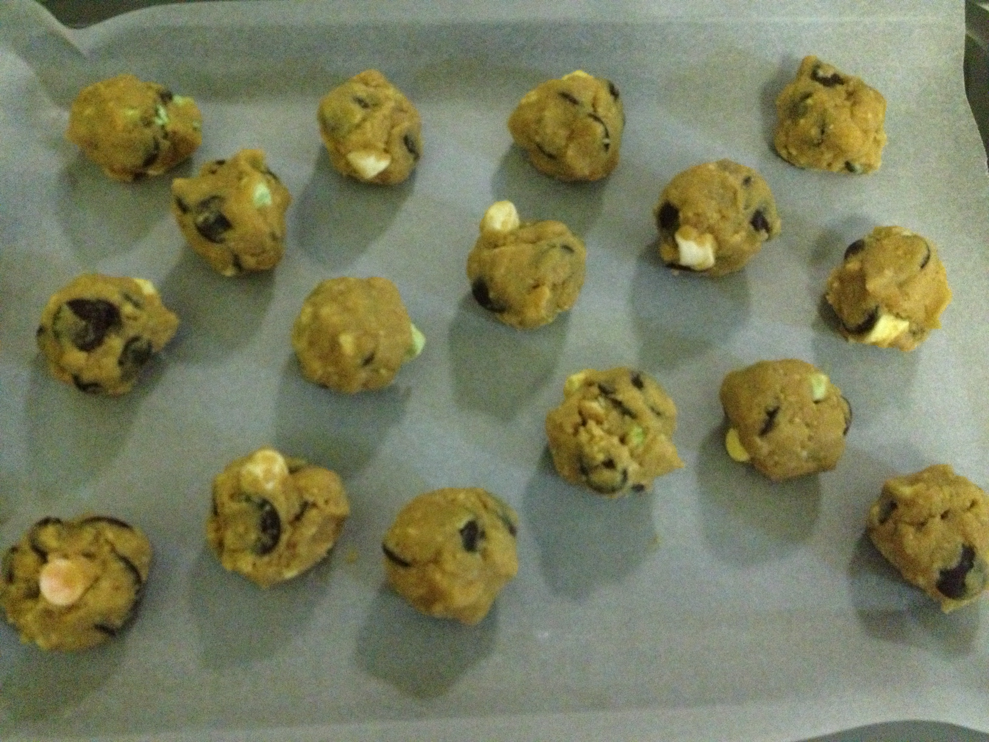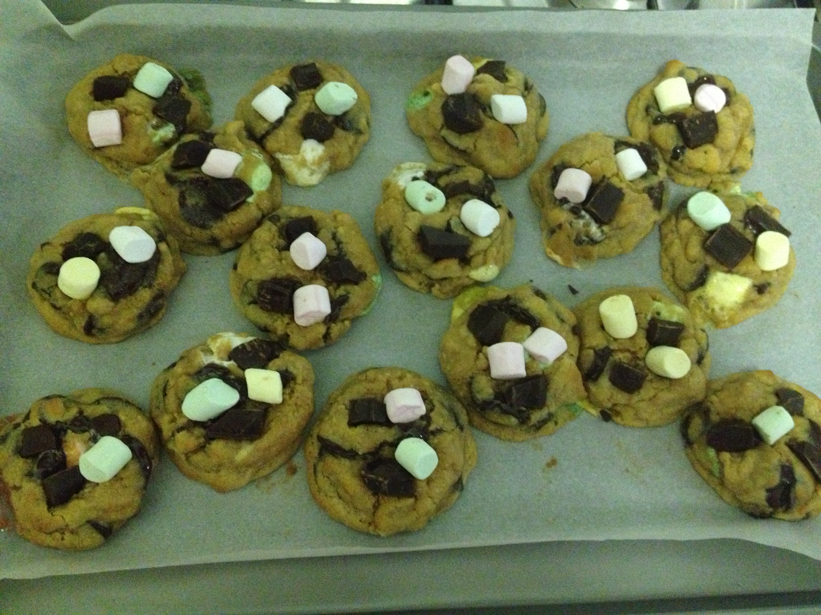 Cookies halfway through baking – press a few marshmallows and pieces of chocolate onto the top