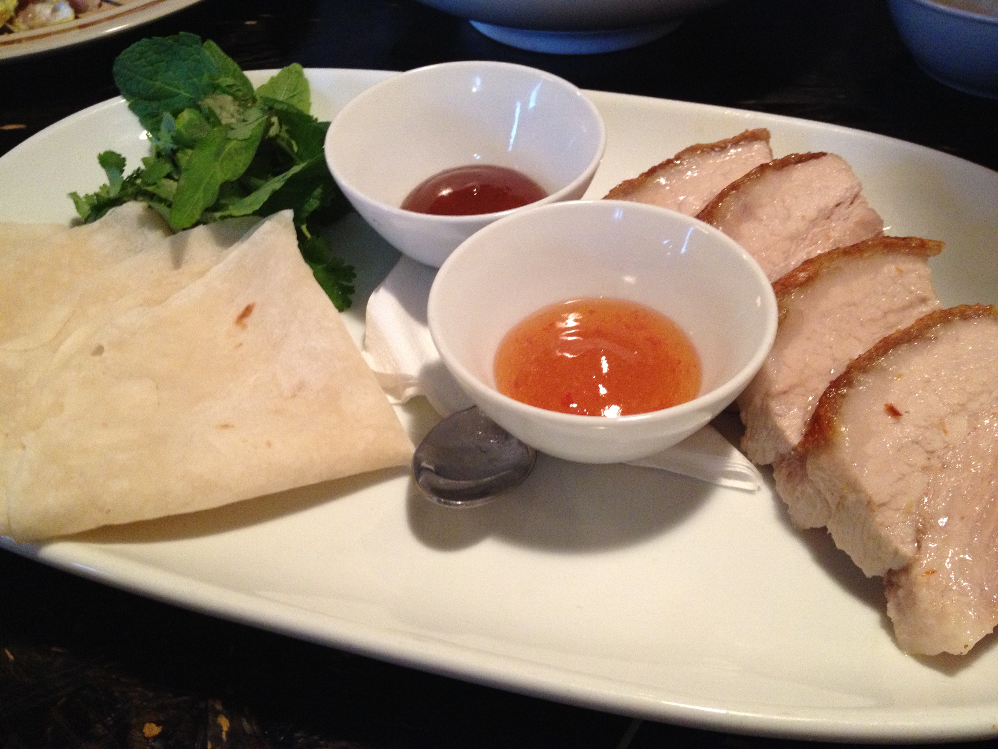 DIY roast pork pancakes – basically slabs of pork belly with some pancakes, delicious variations on hoisin sauce, and fresh herbs. I have to say I like Chin Chin’s version of the dish a bit better – the pork belly was delicious but I would have liked it to not be in such a big piece, and perhaps have a few more vegetables with all that fat