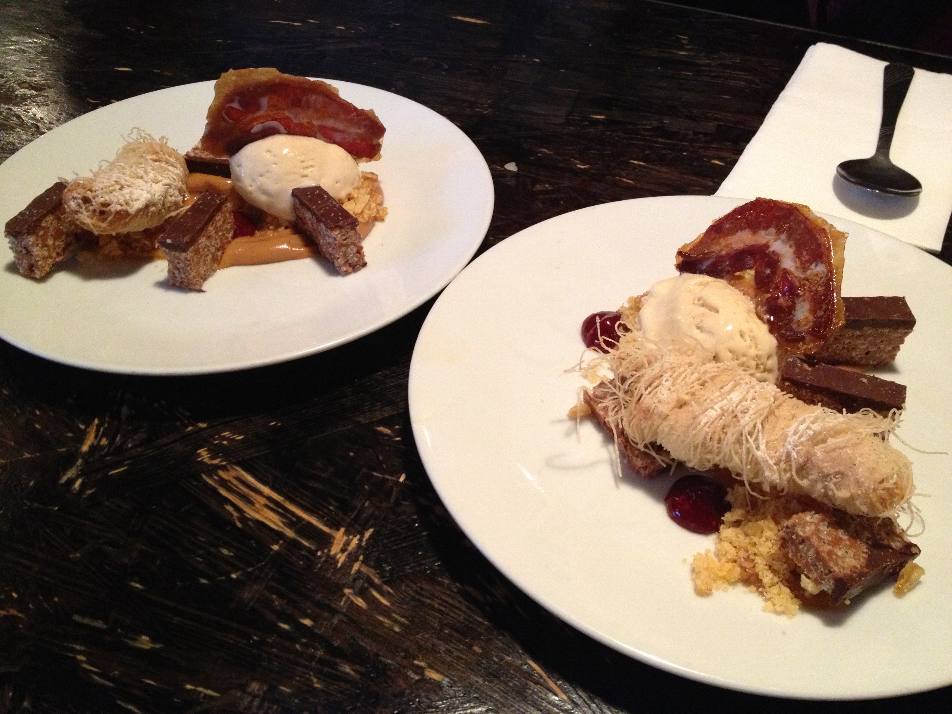 The most ridiculous dessert ever, called Stoner’s Delight 2.0: it includes doughnut ice cream, peanut butter and raspberry sauces, candied bacon, a banana fritter, and a mars bars esque concoction. Hello, artery clogs. However it is quite small and sharing two among four people was certainly manageable. 🙂