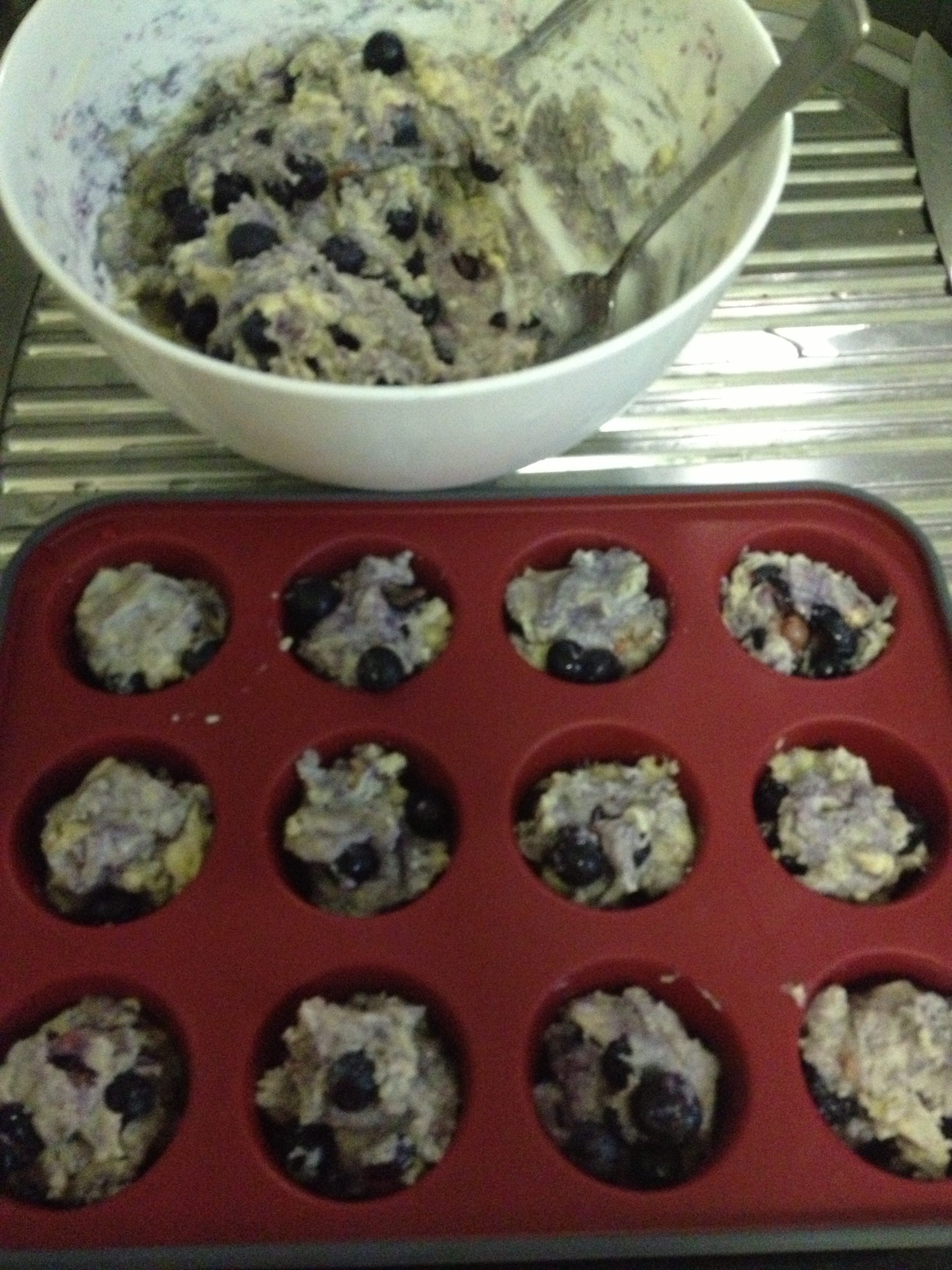 Once the dry ingredients and blueberries are mixed in, fill the muffin cups