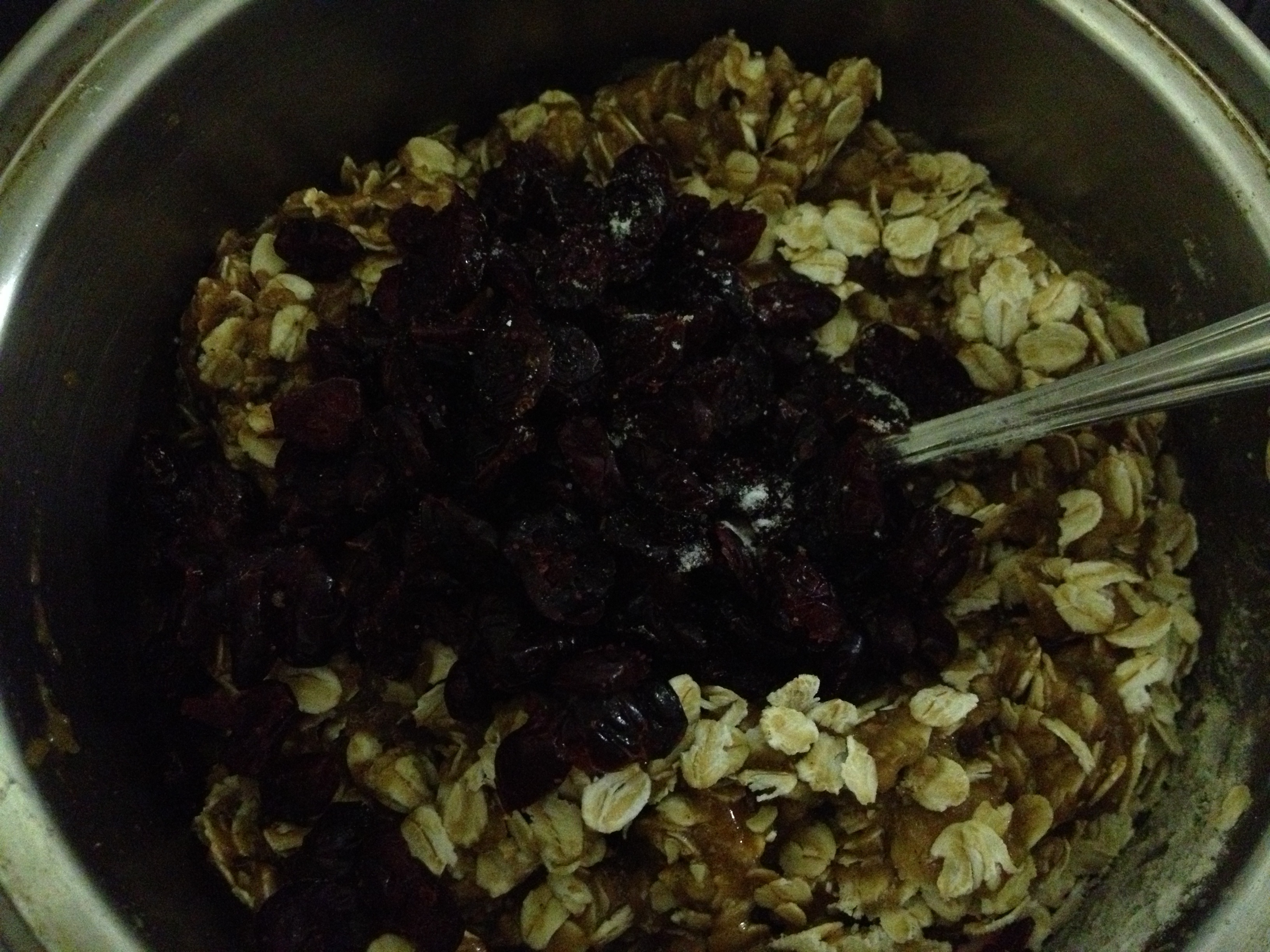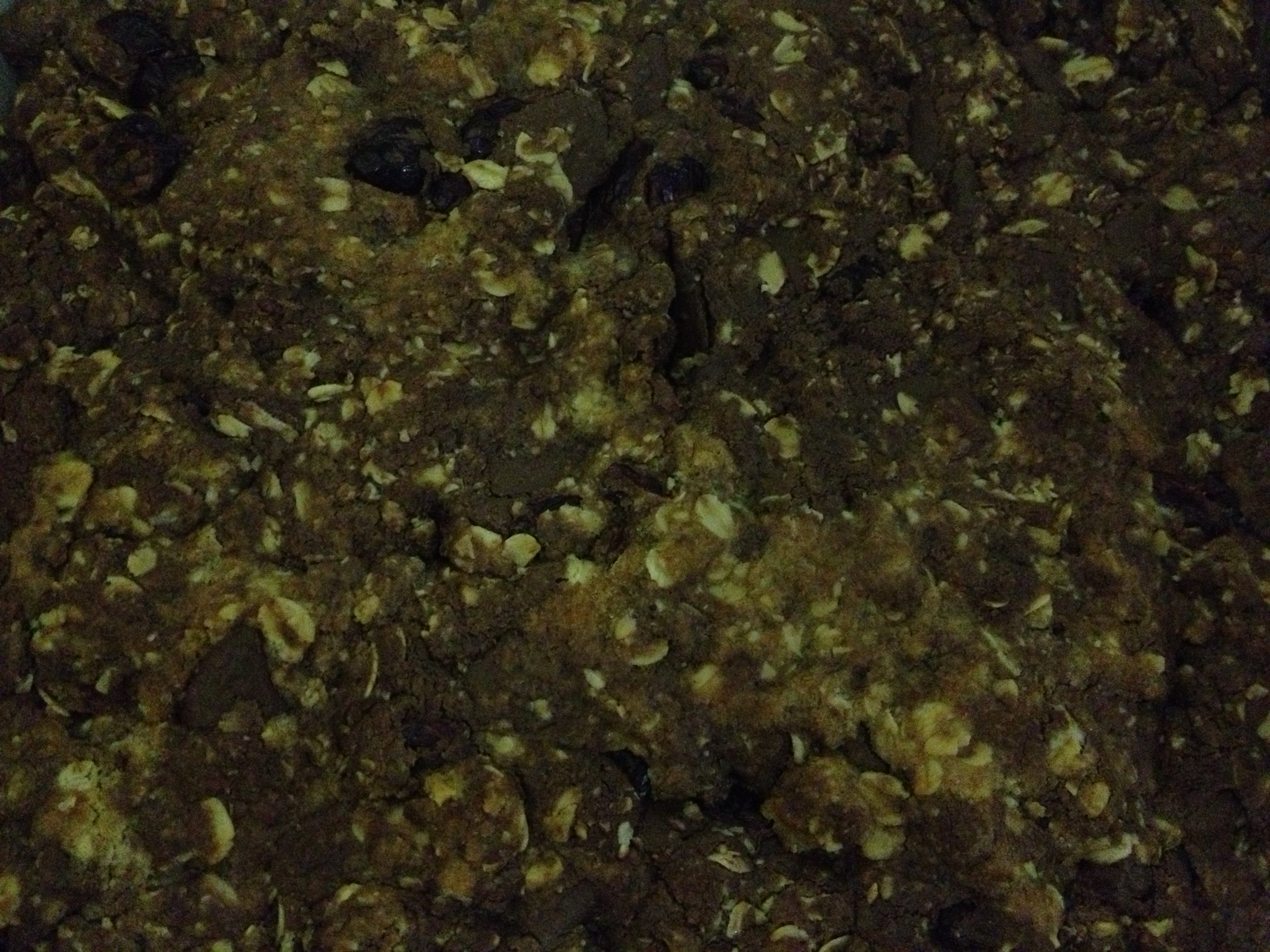 Let it cool for about 15 minutes.  Then, pre-heat the oven to 180 C / 350 F.  Add both sugars and beat them in until it’s smooth.  Add in the eggs and vanilla and beat them in until smooth again.  Then put in the baking soda, salt, and cinnamon.  In the microwave, melt the 1.5 cups of chocolate chips – stir at 30 second intervals to make sure that it doesn’t burn.  Add in the melted chocolate to the bowl, and then mix in the flour.  Then add in the oats and dried cranberries, and then add in the remaining cup of chocolate chips or chopped chocolate.  At this point, it’s probably best if you use your hands to make sure everything is all mixed in.