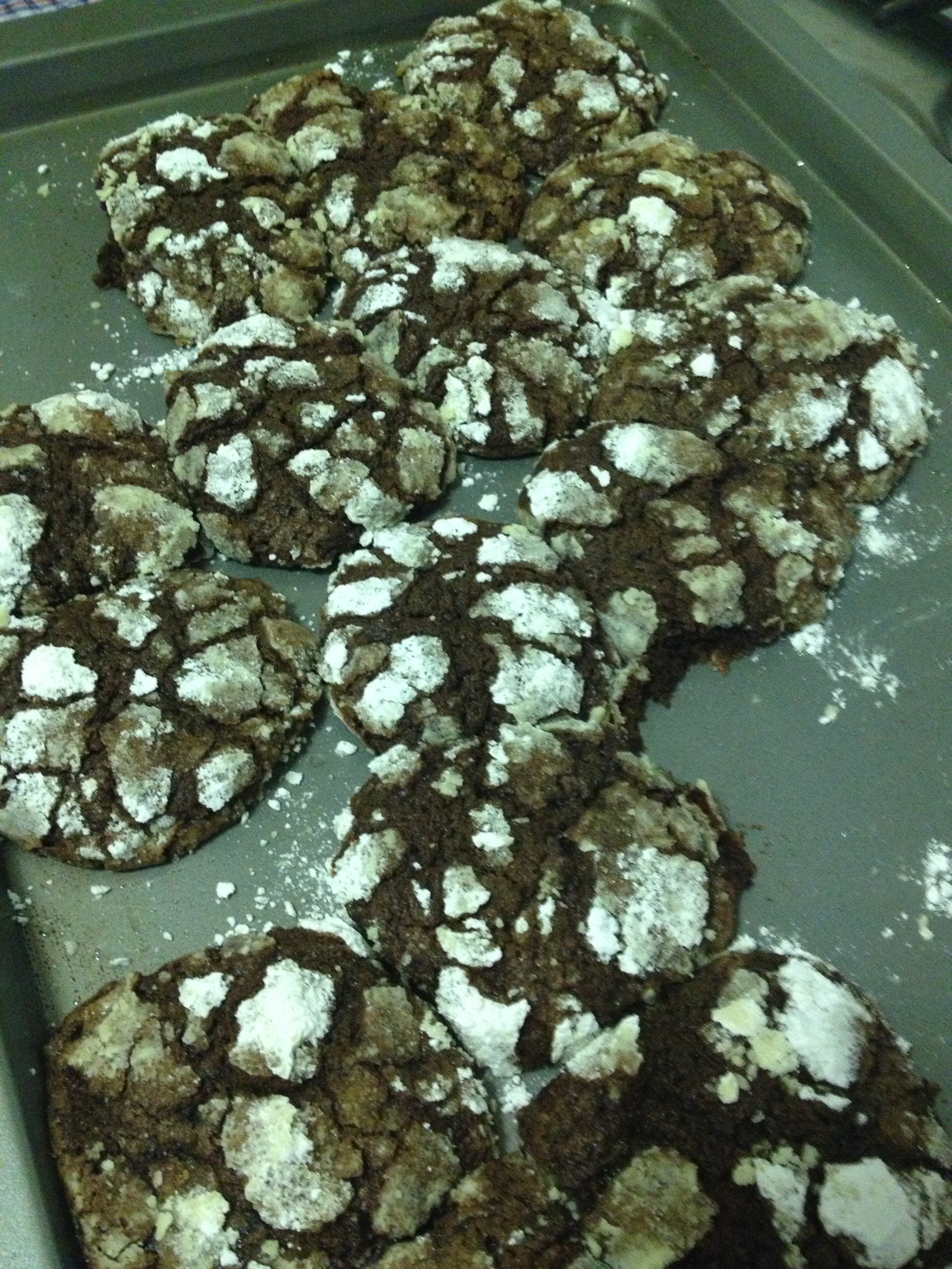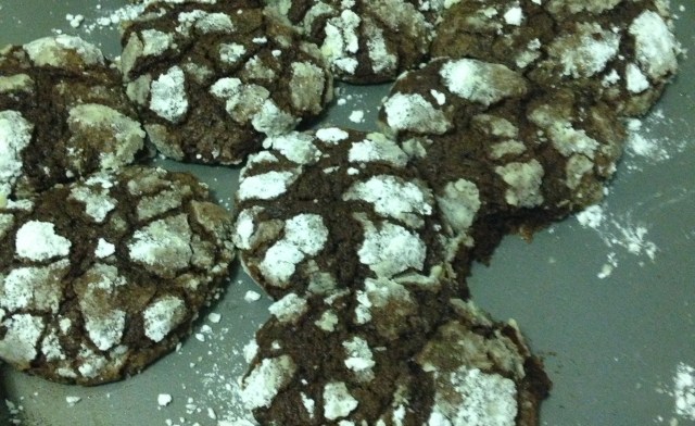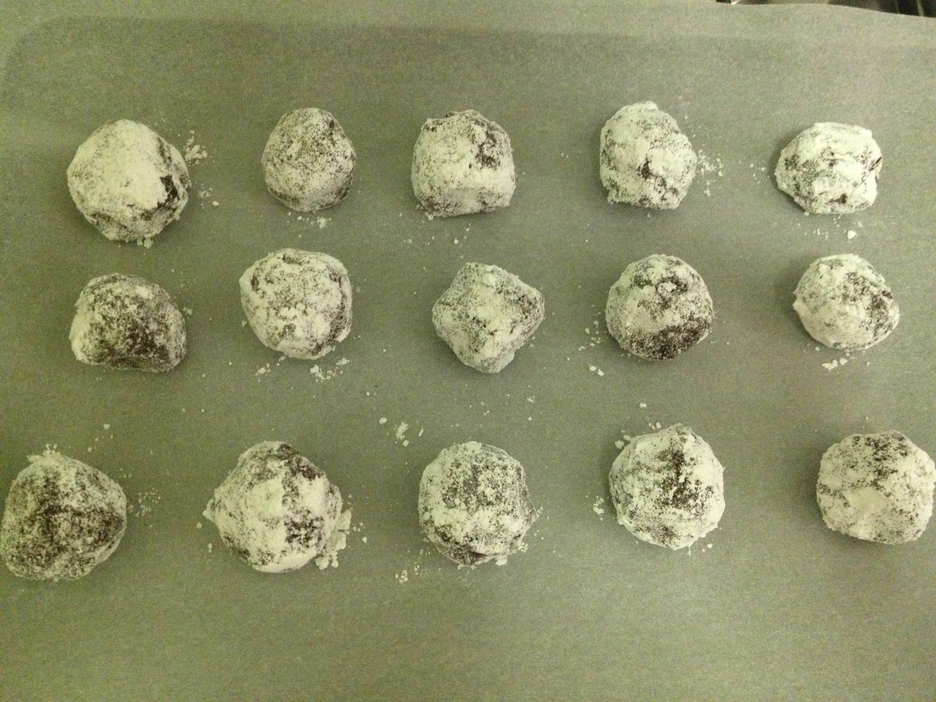 Preheat the oven to 180 C / 350 F. Pinch off pieces from the dough and roll into little balls (they will spread so they don’t have to be very big). Coat each dough ball in granulated sugar and then in powdered sugar and place on a parchment-lined baking sheet, leaving space for them to spread. Bake until the surfaces crack – about 14 minutes. I also rotated my baking sheets halfway through the baking time. Remove from baking sheets to cooling racks until completely cooled. You can take them out when they are still a bit soft but just make sure they cool before you move them around a lot as they break apart rather easily when warm (oh well, then you have to sample them). This recipe makes a large amount – about 50-60 cookies, so feel free to halve it.