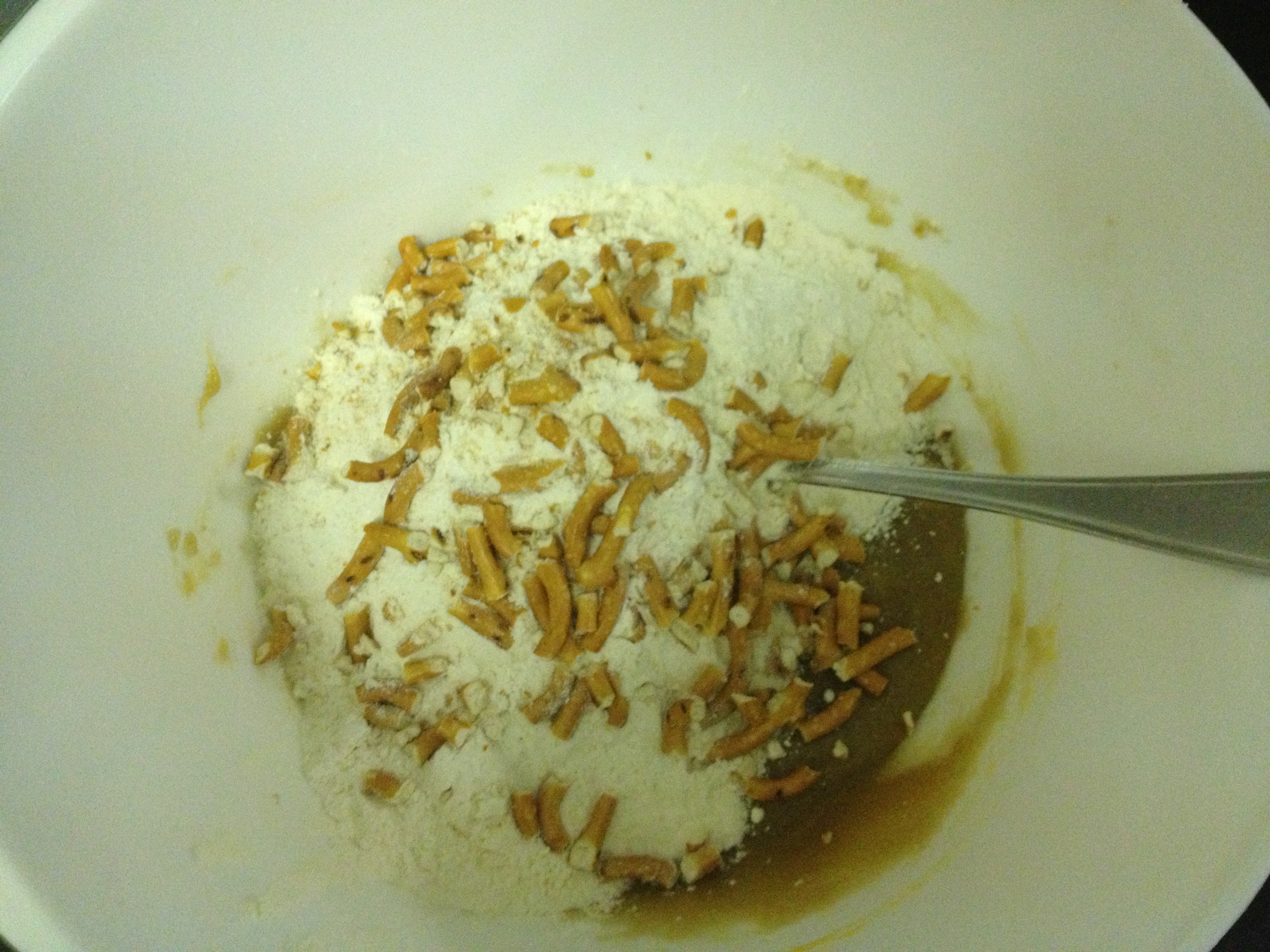 Adding the flour and the pretzel pieces