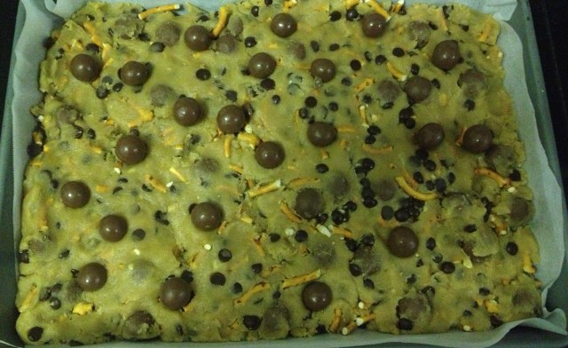 When I bake and make up my own recipes, I’m actually quite imprecise. I know baking is supposed to be this exact science but I am quite relaxed about adding things – probably because I’ve just done it so many times before, but my point is to just experiment and have some fun with this. it’s quite a basic dough so just add whatever you might have on hand – crushed biscuits, nuts, white chocolate chips, etc. I personally love adding pretzels because of the salty sweet contrast and if you like malt balls at all I highly recommend adding them in since it adds a great new dimension to the bar.