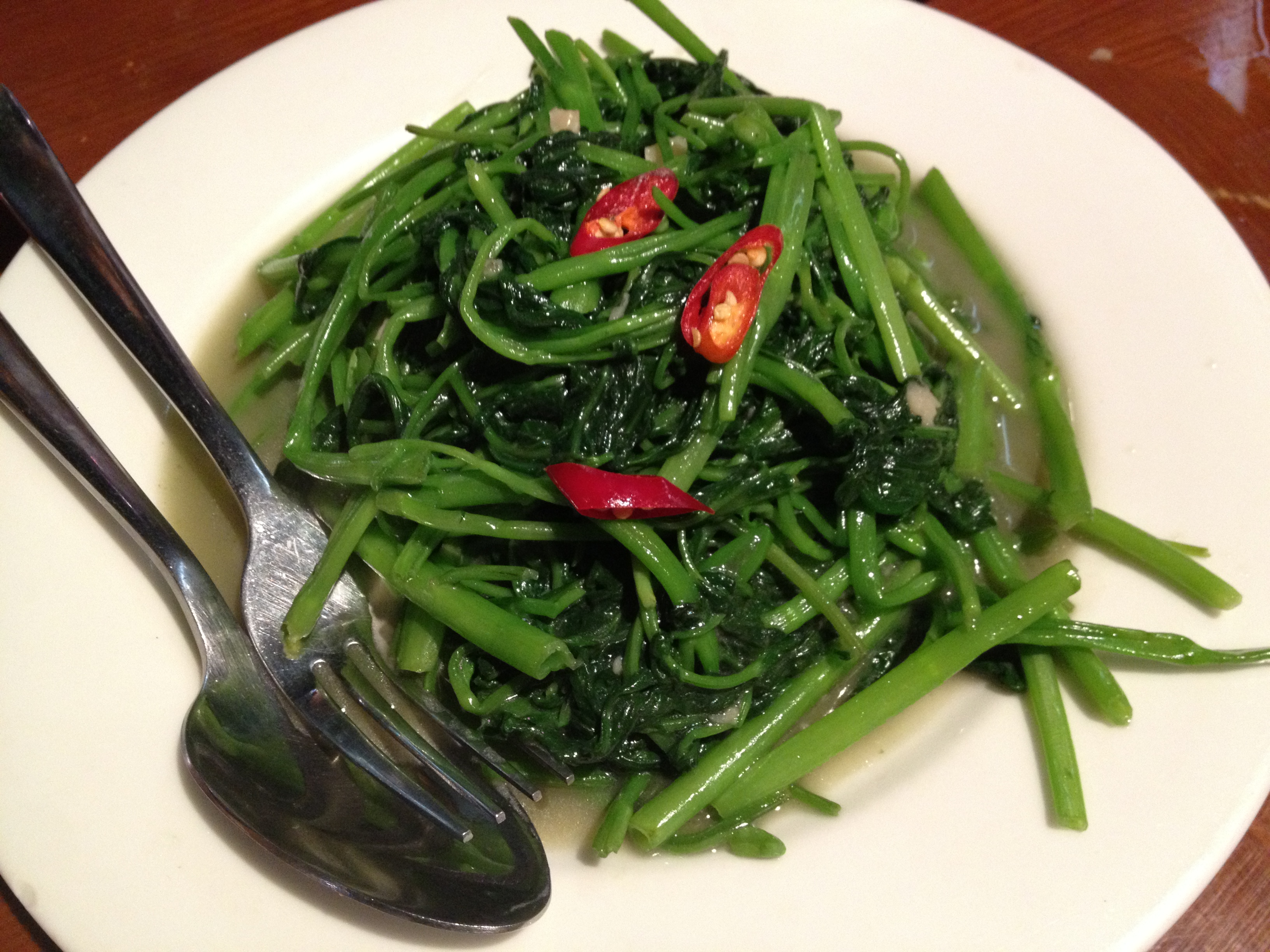 Morning glory (a type of water spinach) sauteed with garlic and chilies. Love this. I adore Asian vegetables because I normally don’t cook them myself at home but just love anything stir fried in a wok that’s green.