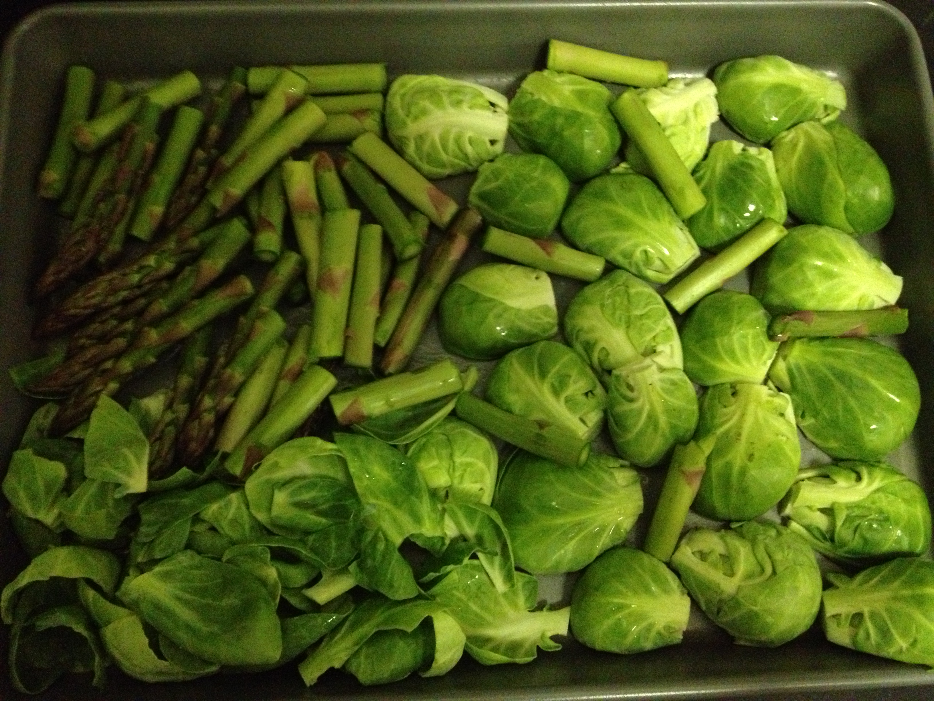 Asparagus and brussels ready to roast in the oven…not pictured (naturally I forgot) is another big sheet where I roasted parnsips, carrots, and eggplant