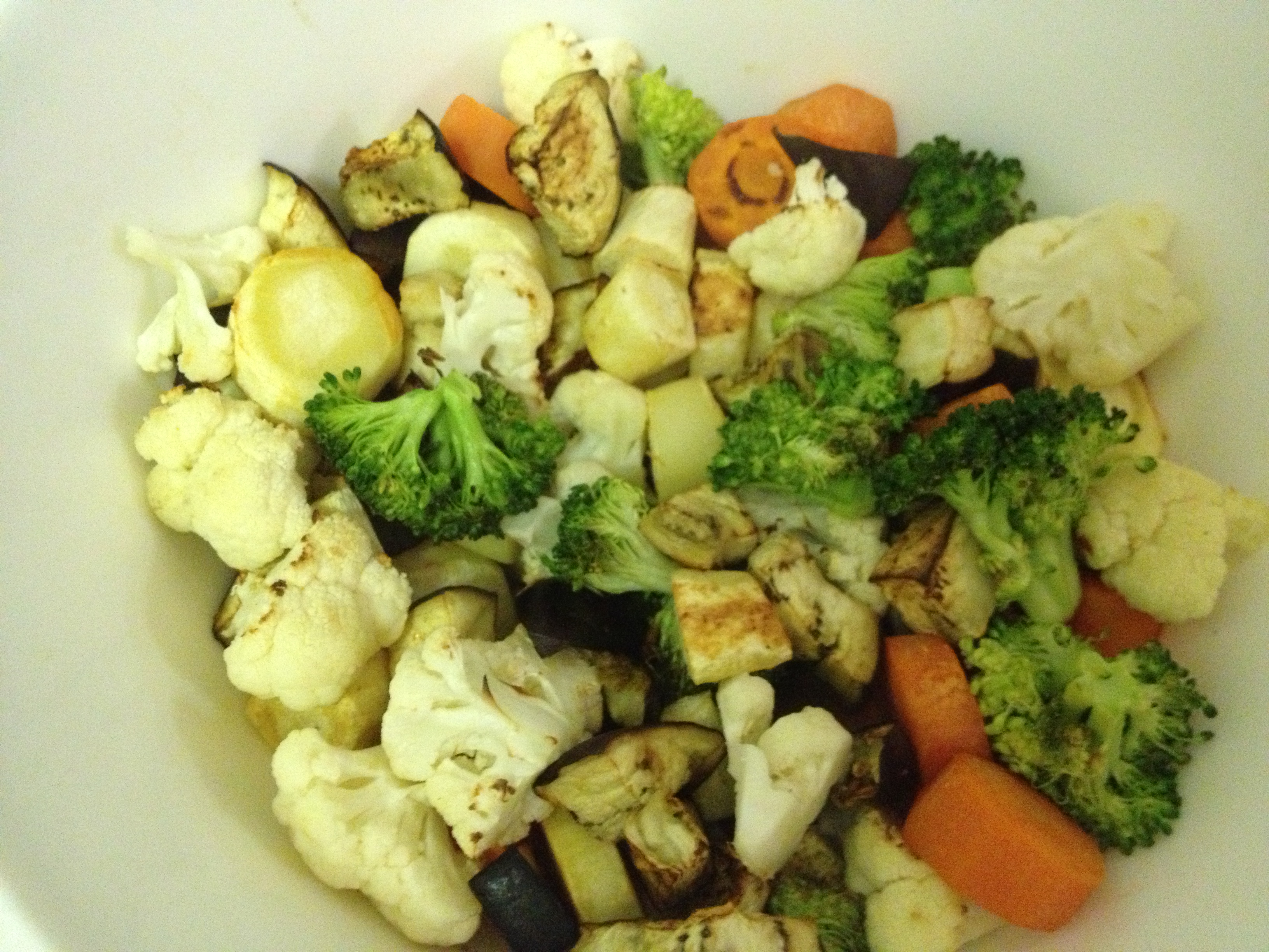 As I’ve mentioned several times on this blog I”m sure, roasting times can vary greatly depending on the oven and the type of veggies. My carrots and parsnips sheet probably took about 30 minutes, but in my weird convection oven, broccoli and cauliflower can sometimes take as little as 15. So keep an eye on them! About 15 minutes into the tofu time, take out the sheet and flip each piece over so all the pieces can be browned evenly.