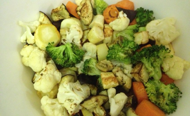 As things get done, dump them in a large bowl – here is where I like to coat lightly with olive oil if you haven’t already done so. Season everything with sea salt and freshly ground black pepper to taste. This tastes great served right away or store in the fridge and heat it up for lunch leftovers throughout the week!