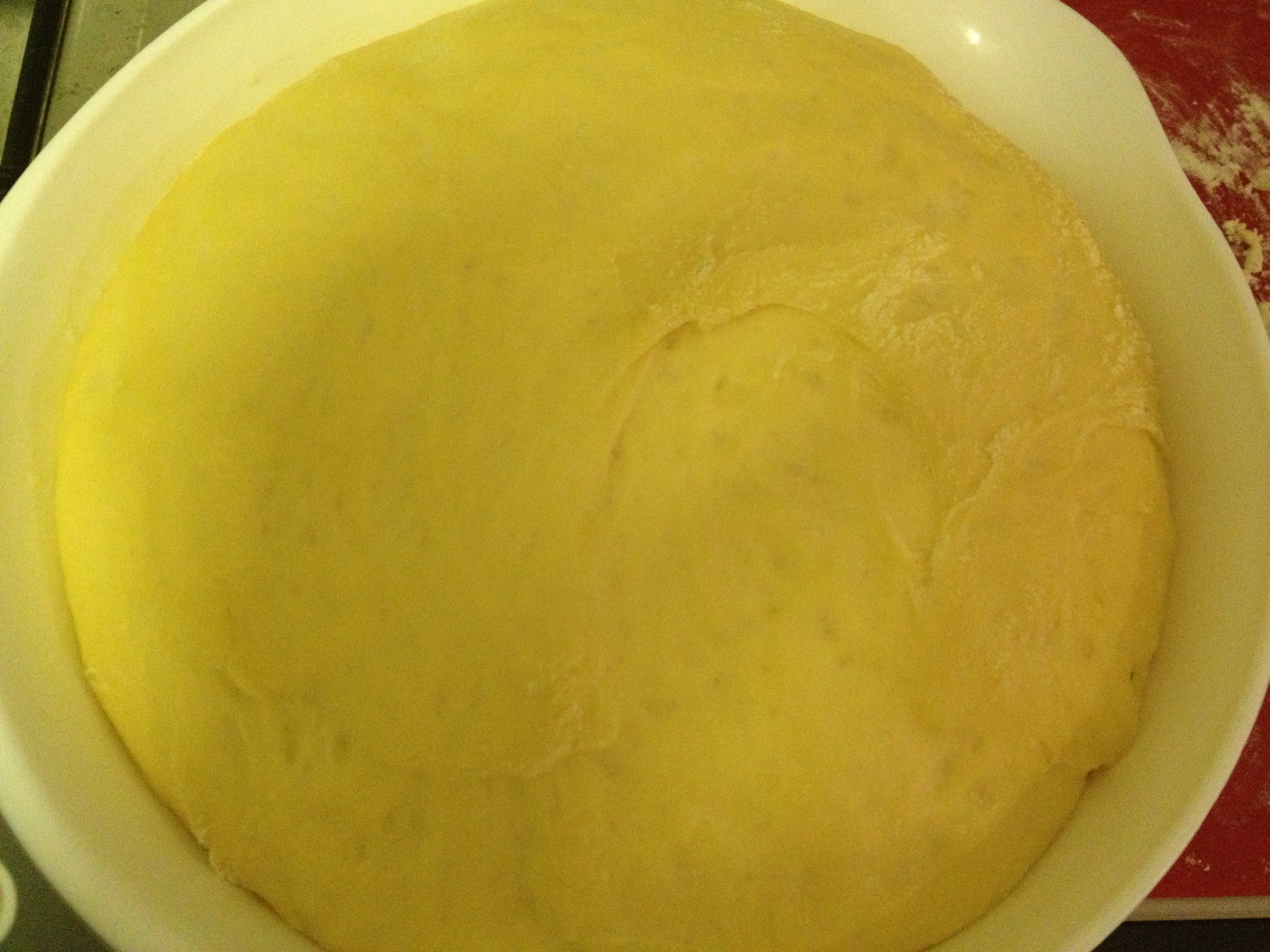 Then, add the remaining 1/2 cup sugar, oil, eggs, and salt, Whisk until completely combined. Slowly add the flour one cup at a time. Eventually it will start to become a soft dough. You may not need the full amount of the flour, but you want to make sure it’s easy enough to pick up so you can take it out of the bowl and put it on a floured counter. When it’s still a bit sticky, do this and knead on the counter while putting more flour on it. By the end of the process it should be a smooth dough. Form it into a smooth ball (seriously the kneading process is so fun so just enjoy it). Grease a large bowl (the mixing bowl will do if it’s large enough – just rinse it out and grease it) with vegetable oil. Drop in the dough ball and turn over to coat both sides. Cover loosely with plastic wrap and a damp cloth. Place in a place for about 1 hour, or until doubled in size.
