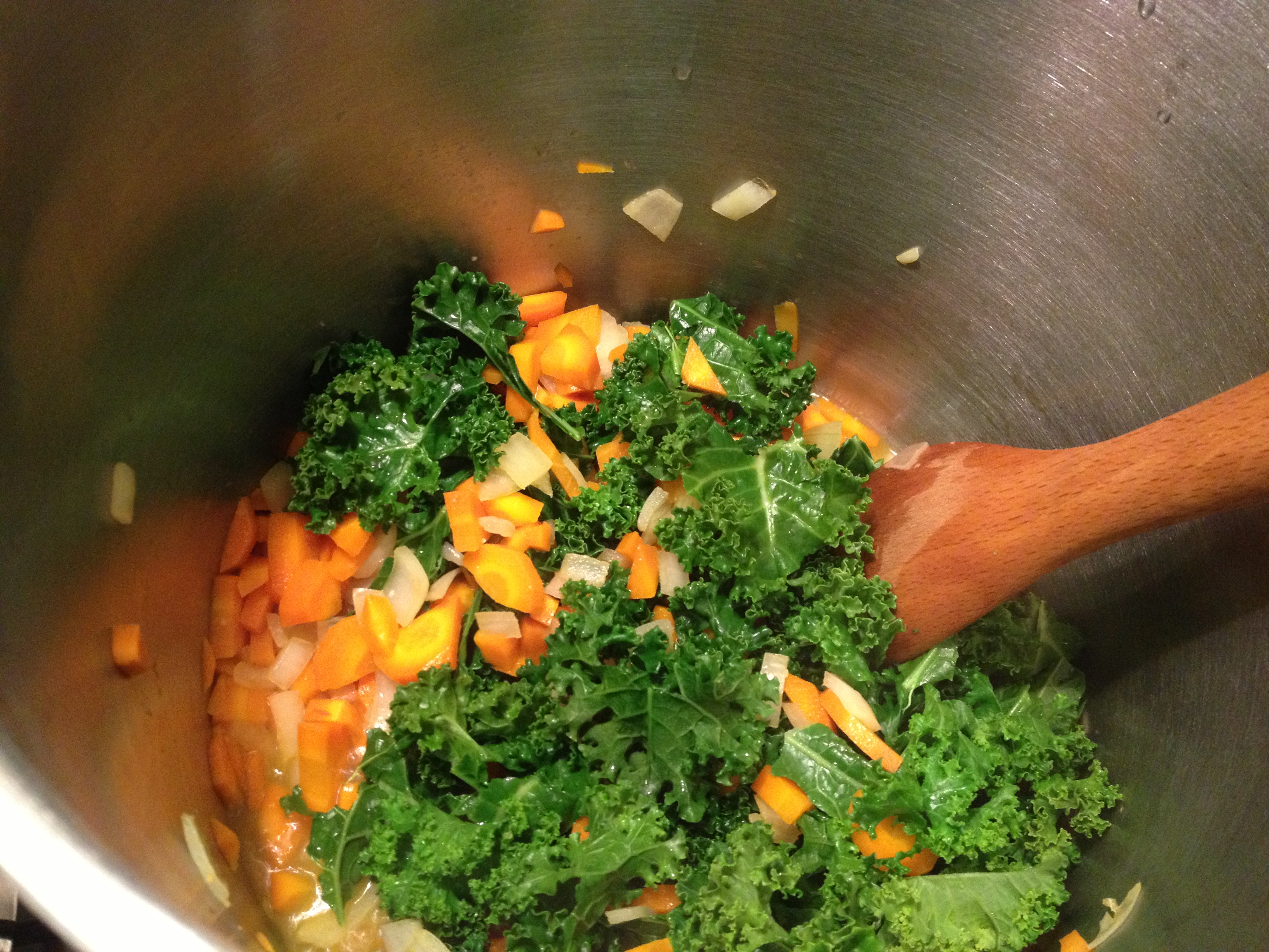In a large pot, heat the olive oil or spray thoroughly with non-stick spray. Add garlic, onion, and carrot and sauté until onion is transparent. Since I just used non-stick spray, I added a splash or two of broth to make sure nothing stuck to the pan. Then add the kale and saute, stirring until it is slightly wilted and bright green. If anything is sticking pour in a splash of the broth. Then pour in the broth, tomatoes, and beans. Season with the spices. Simmer over medium heat until vegetables are tender and the soup is heated completely through, about 15-20 minutes. I let my carrots and onions cook for a bit longer before adding in the kale and the broth so the whole soup probably only took about 15 minutes or maybe even a bit less once the beans were added. Make sure to taste it so it turns out just right for you.