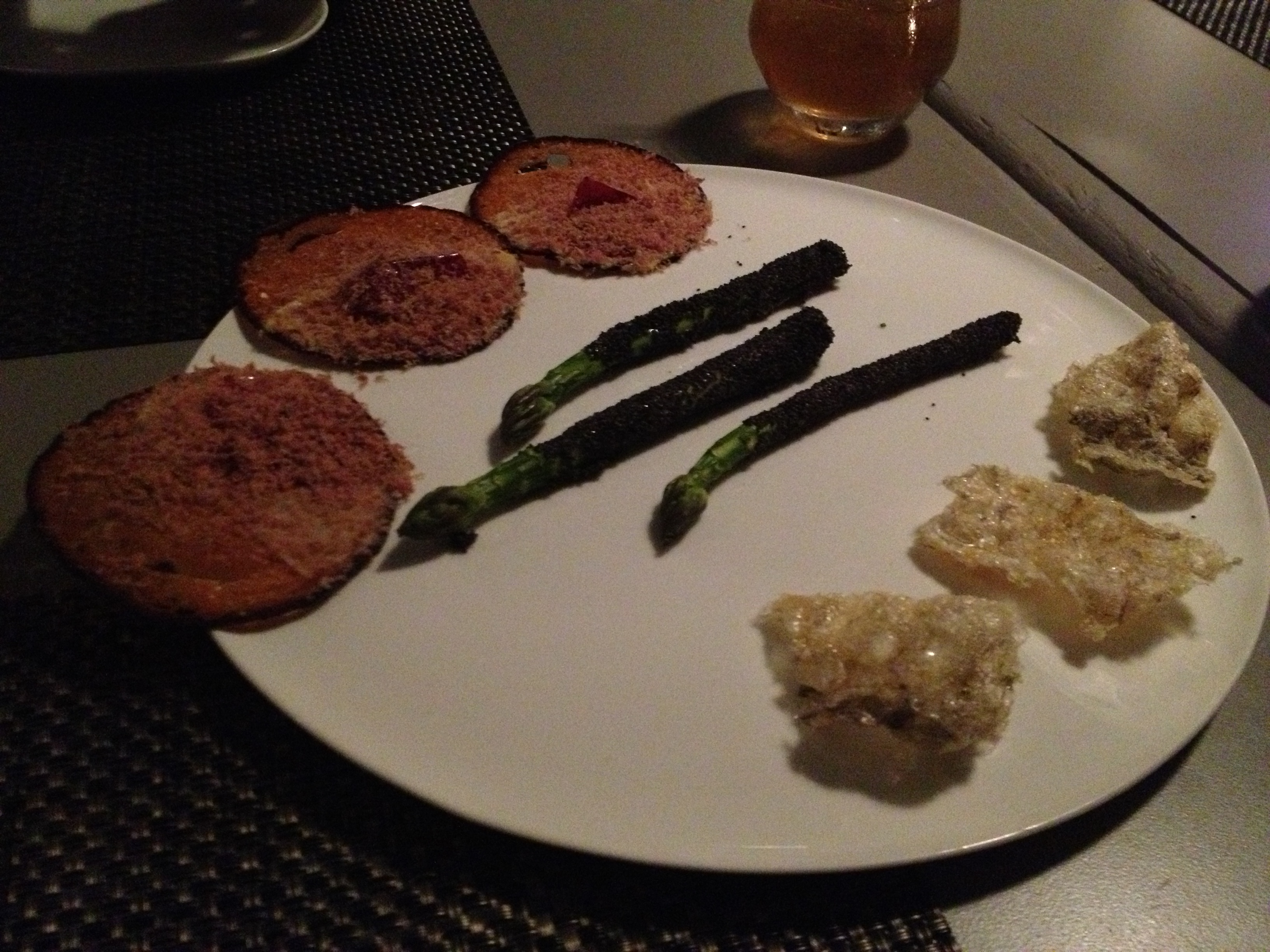 From left to right, little crostini that have powdered duck (don’t ask me how) with rosewood jelly on top, asparagus dipped in lemon curd and rolled in poppy seeds, and crispy barramundi skin. What an incredible opener. The combination of the asparagus with the lemon curd was particularly amazing. Each of the bites was so unique and delicious!